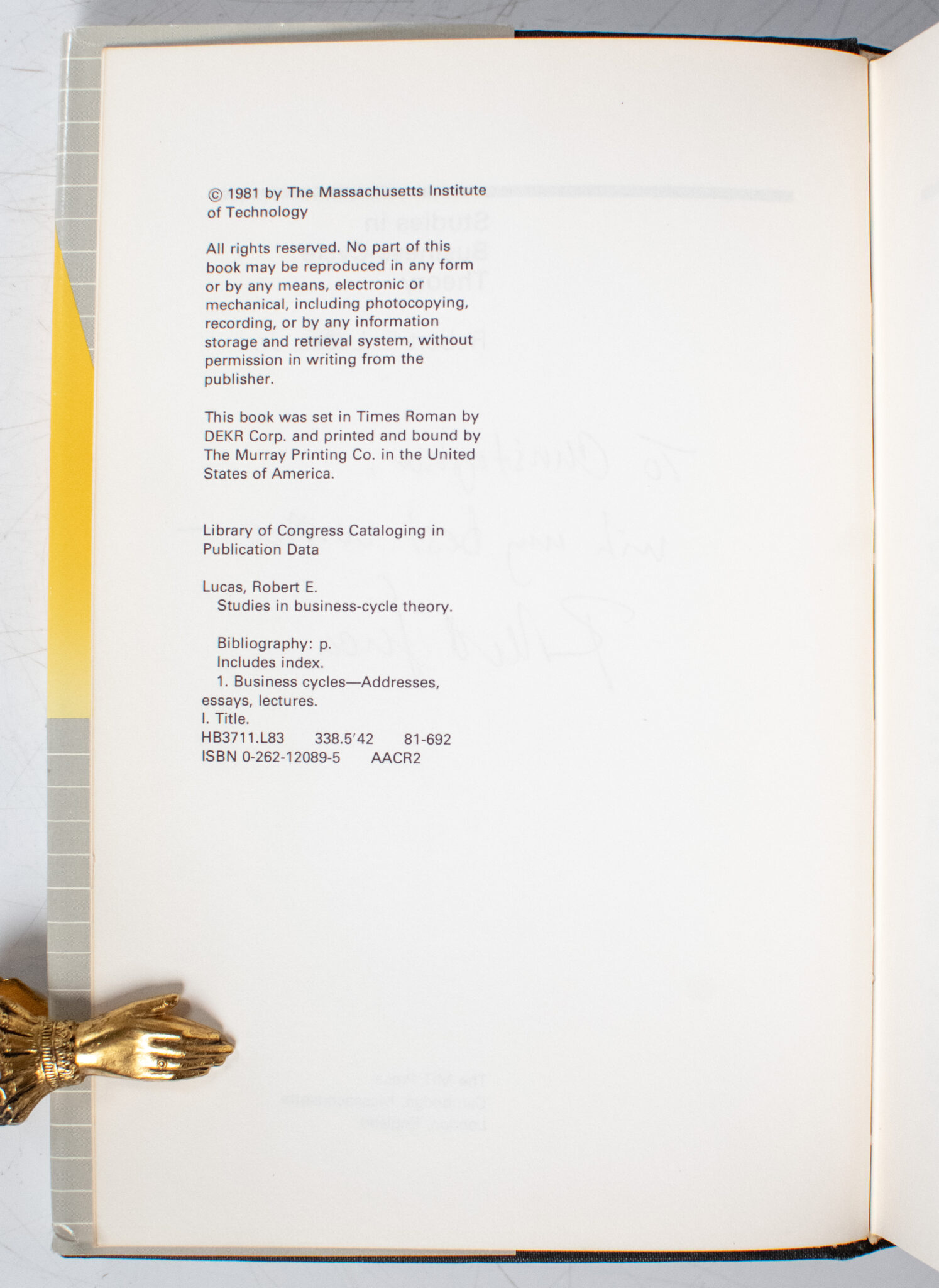First Edition of Robert E. Lucas' Studies in Business-Cycle Theory; Inscribed by Him