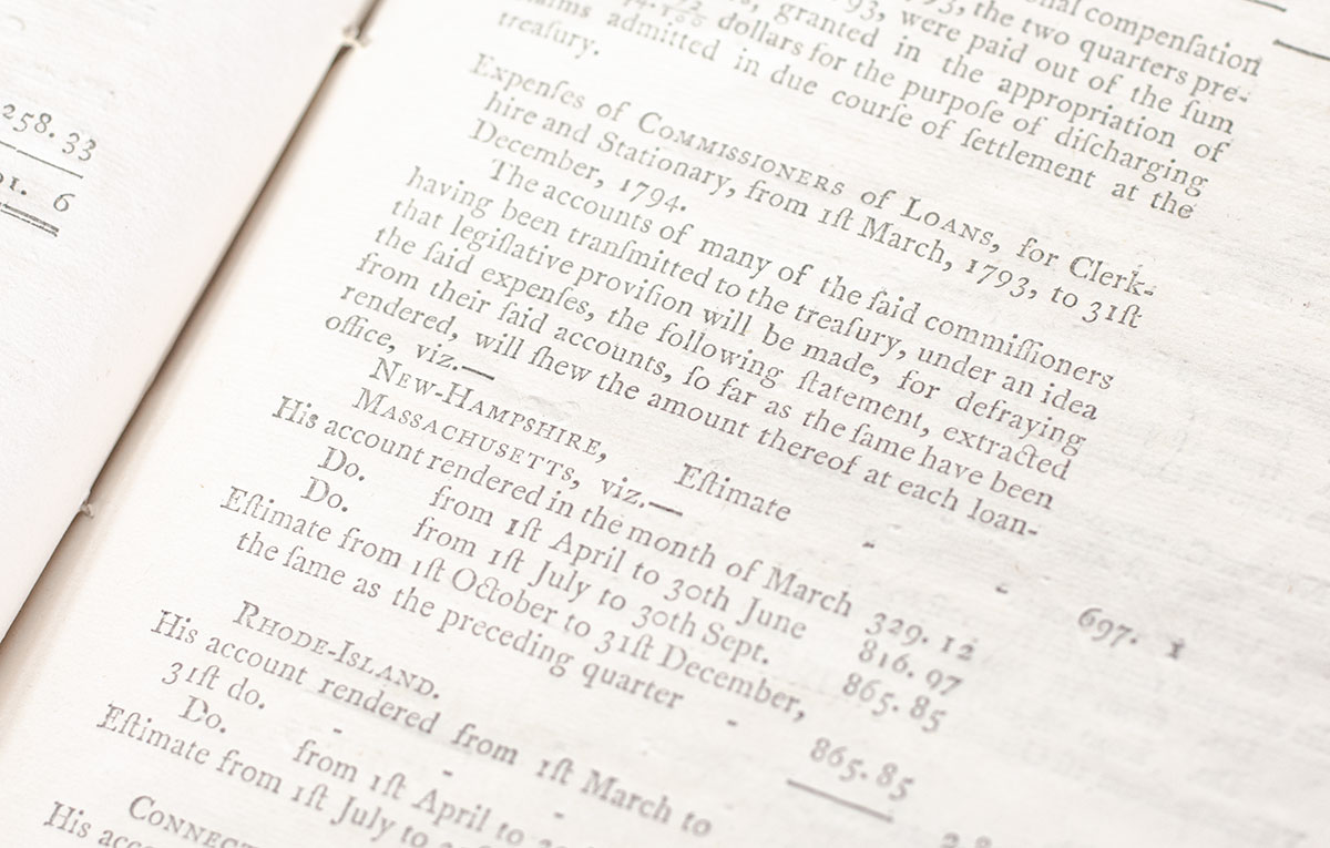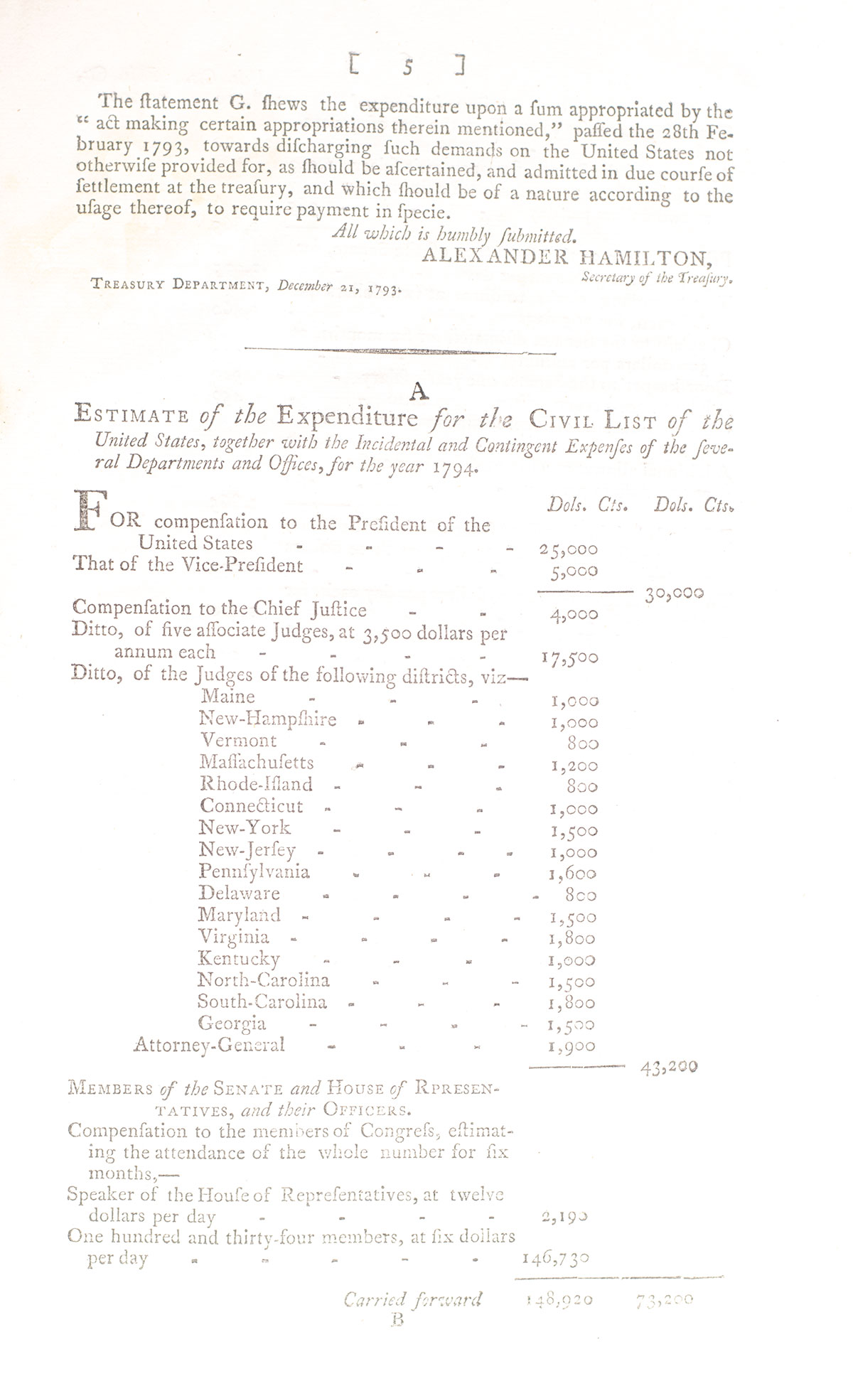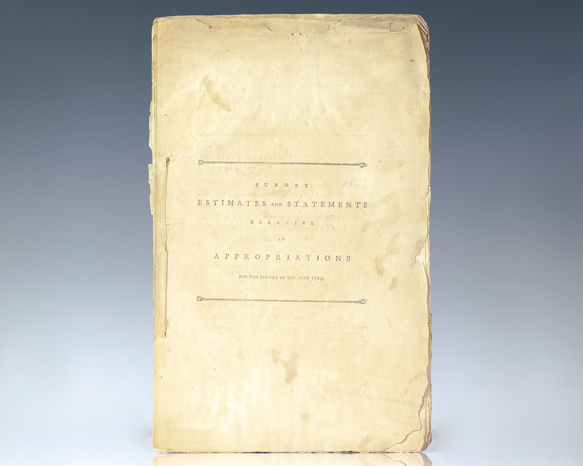 Rare printed Treasury Department report detailing projected expenditures by the federal government for the year 1794. Quarto, 20 pp. Includes reporting on sources of revenue, duties on imports and tonnage, provision for payment of interest on balances due to the individual states, as well as interest on the public debt. Also printed is expenditures for the Civil List for the various branches and departments of the federal government, including the executive, both houses of Congress, the War Department, Indian Department, etc. Finally, printed toward the rear is a list of the revenue and appropriations for 1789-93, the amount of duties and tonnage accrued from January-June 1793, and monies transferred to the United States out of the proceeds from foreign loans. In very good condition. Rare with only one example appearing at auction in the last 80 years.
