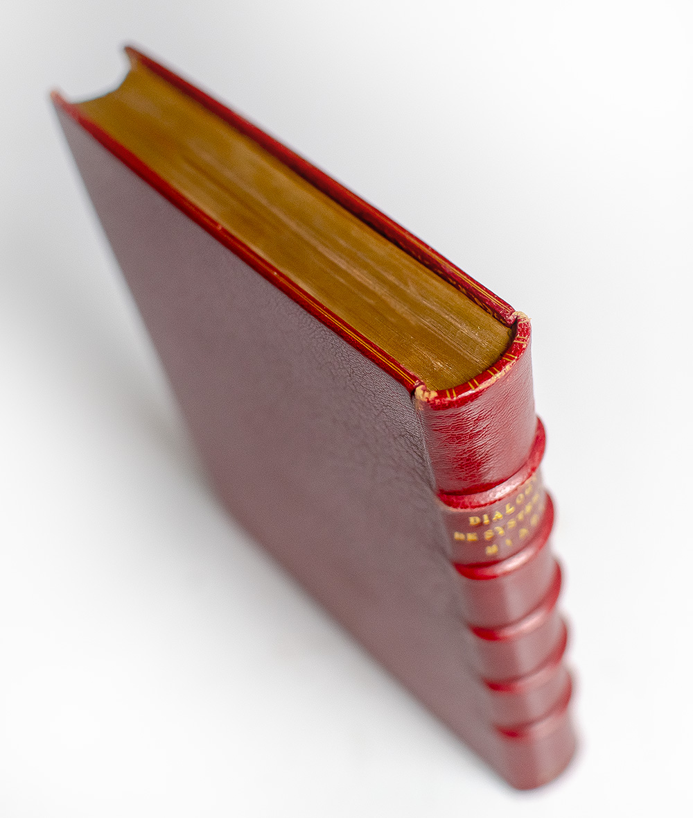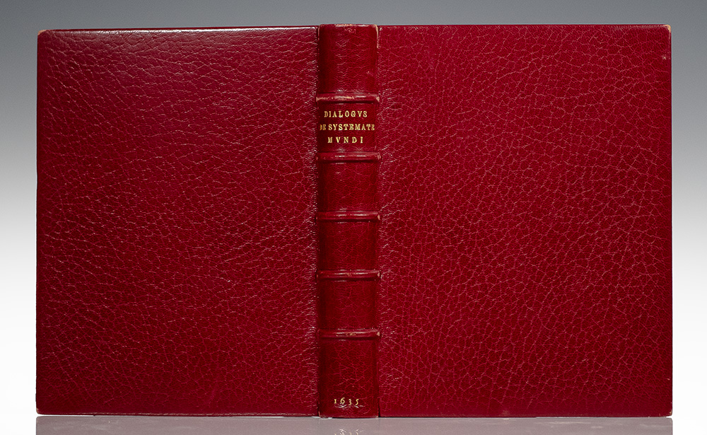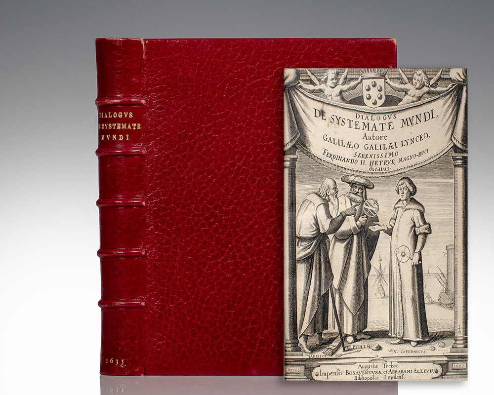 First Latin edition of the Dialogo, the summation of Galileo's astronomical thought and the work which directly precipitated his 1663 trial and judgement for heresy. Preceded only by the first Italian edition, published in Florence in 1632. Quarto, bound in full red Jansenist morocco by Marius Michel with gilt titles and five raised bands to the spine, double gilt ruled turn-ins and elaborately gilt ruled and scrolled inner dentelles stamp-signed by Michel, marbled endpapers, all edges gilt. Additional engraved title page depicting a dialogue between Aristotle, Ptolemy and Copernicus, engraved portrait of Galileo by Jacob van der Heyden, errata leaf. The Dialogo takes the form of a conversation between supporters of the rival cosmic systems; although ostensibly impartial, it proved a step too far, and in 1633 Galileo was tried, forced to abjure Copernicanism and sentenced to permanent house arrest. The Dialogo itself was banned. This Latin edition includes two tracts in the appendix not in the Italian edition of 1632, and it is the only major work of Galileo's to be published outside Italy during his lifetime. The two added Latin tracts are the introduction to Kepler's Astronomia nova (pp. 459-464), and a letter by Paolo Antonio Foscarini defending the truth of Copernicanism and rebutting the charge that it conflicted with scripture (pp. 465-495). Brunet II, 1462; Carli and Favaro 148; Cinti 96; Riccardi I, 513; Willems 426; PMM 128. Provenance: from the library of Albert Linemann, 1603-1654, astronomer and professor of mathematics at the University of Konigsberg, inscription to the title page. Born in Fischhausen, Linemann was a mathematician and professor known in part for his critical stance against astrological interpretations of the time. Subsequently from the renowned library of American astronomer and historian of science at Harvard University Owen Gingerich, bookplate to the pastedown. In near fine condition with light rubbing to the extremities, lower margin of engraved title extended.