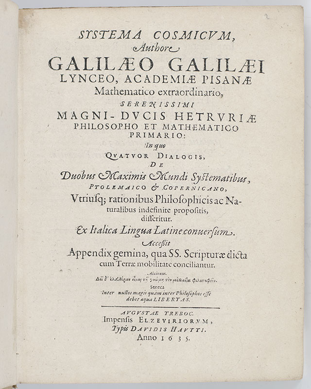 Systema Cosmicum in Quo Quatuor Dialogis, de Duobus Maximis Mundi Systematibus, Ptolemaico et Copernicano. [Dialogue Concerning the Two Chief World Systems].