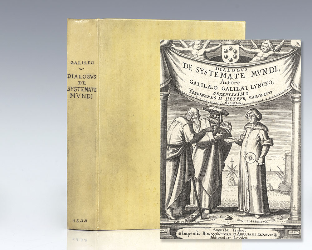 Rare first Latin edition of Galileo's epoch-making Dialogo, the summation of the extraordinary mathematician's astronomical thought and the work which directly precipitated his 1663 trial and judgement for heresy. Preceded only by the 1632 edition in Italian. Small octavo, bound in full contemporary vellum, engraved additional title page, full page engraved frontispiece portrait of Galileo by Jacob van der Heyden, woodcut diagrams, with the final leaf of errata. This Latin edition includes two tracts in the appendix not in the Italian edition of 1632, and it is the only major work of Galileo's to be published outside Italy during his lifetime. The two added Latin tracts are the introduction to Kepler's Astronomia nova (pp. 459-464), and a letter by Paolo Antonio Foscarini defending the truth of Copernicanism and rebutting the charge that it conflicted with scripture (pp. 465-495). With the appendix by P.A. Foscarini which contains an attempt to reconcile the Copernican views with the Holy Scripture. In near fine condition. Exceptionally rare, as the work was rigidly suppressed from the start.