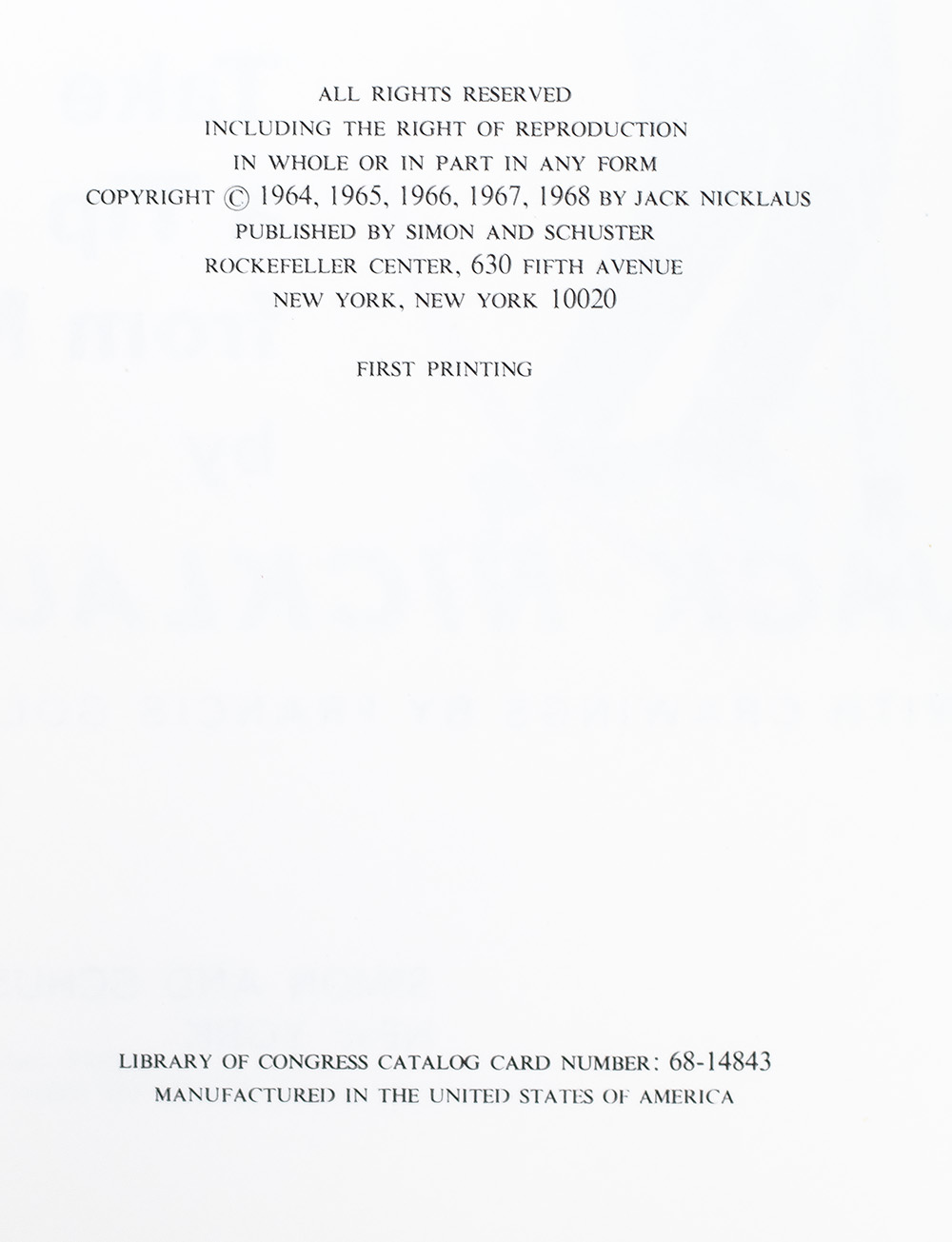First edition of the golfing legend’s second book. Octavo, original half cloth, illustrated. Presentation copy, warmly inscribed by the author on the front free endpaper, "Take a Tip from me Sterling and Hunt is going great Jack Nicklaus." Near fine in a very good dust jacket.