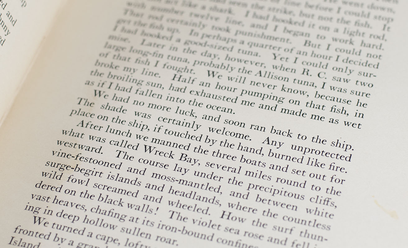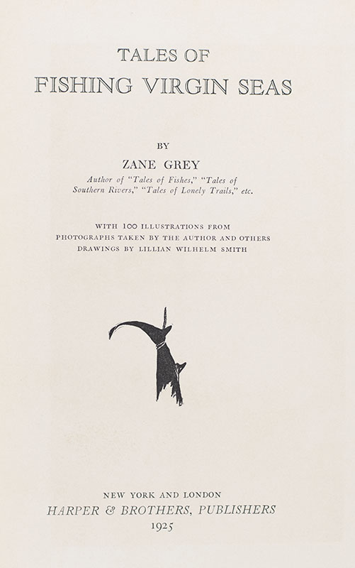 First edition of this thrilling work on fishing for big game fish, such as black marlin, striped marlin, tuna, dolphin, and other species off the west coast of Mexico and the Galapagos Islands. Quarto, original cloth, pictorial endpapers, illustrated with plates from 100 photographs, taken by Zane Grey and others and from drawings by Lillian Wilhelm Smith. Near fine in a near fine price-clipped dust jacket with light expert restoration. Rare in the original dust jacket.