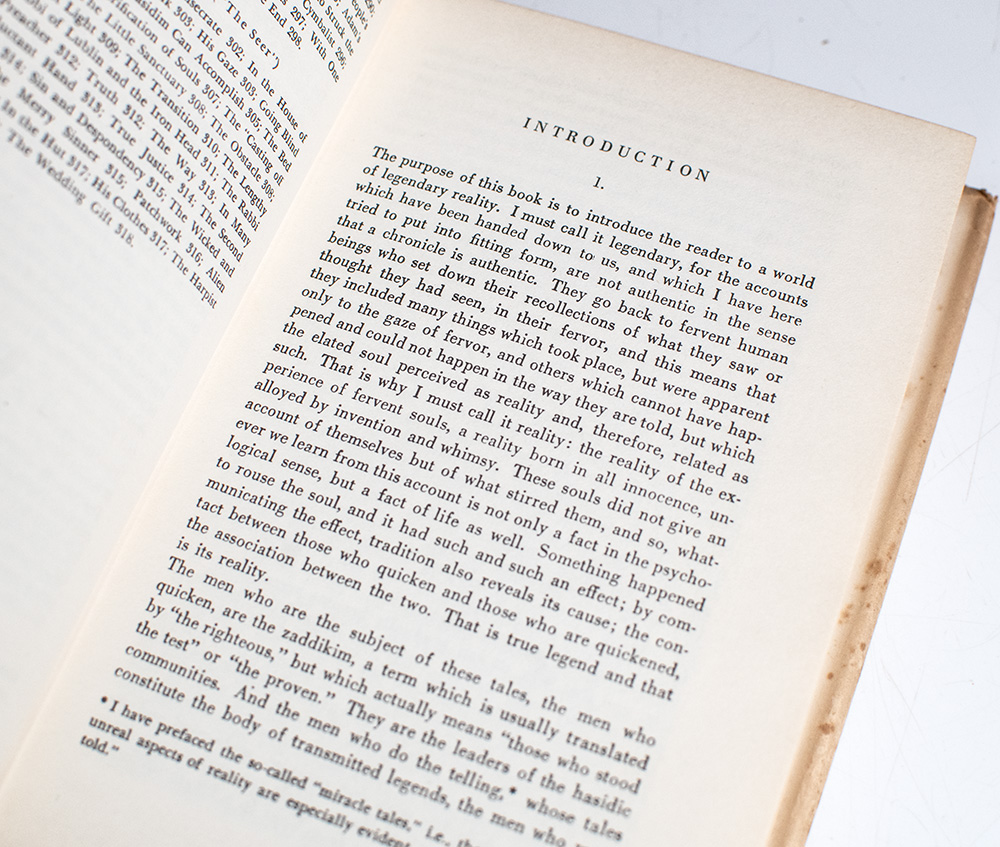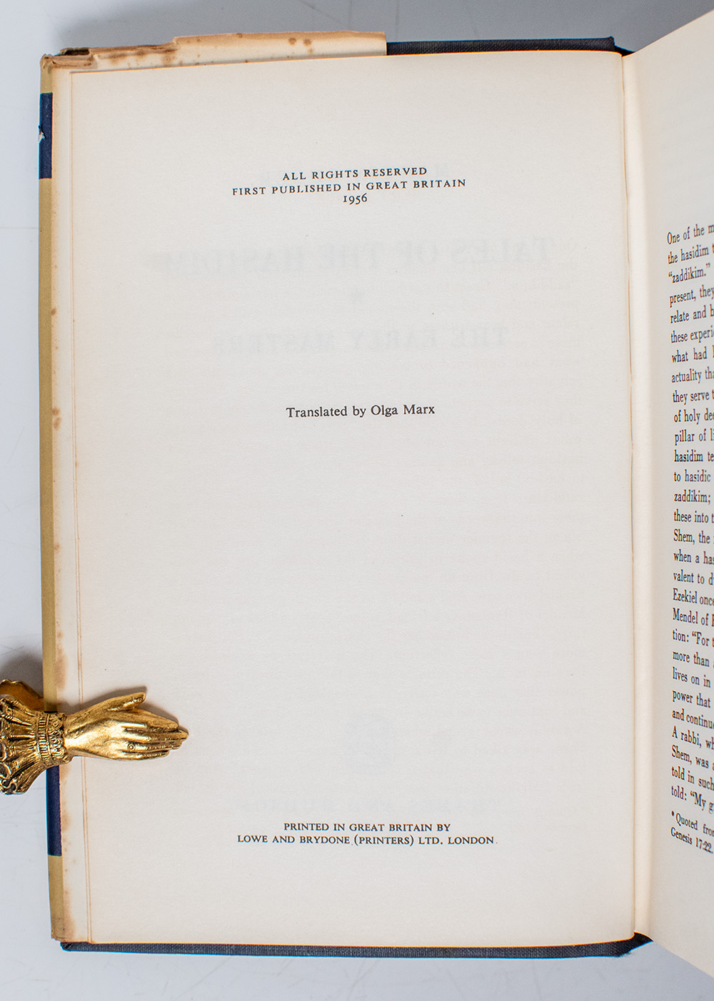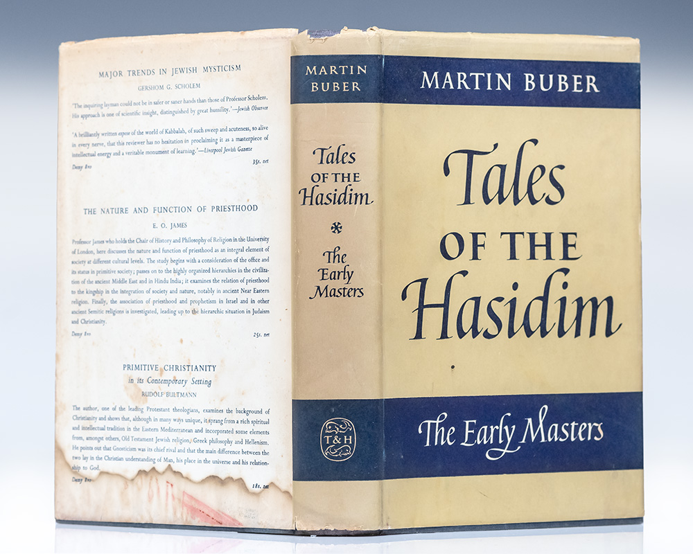 Early edition of this seminal work of the Hasidic movement. Octavo, publisher's original blue cloth with gilt titles to the spine, front panel vignette of whales stamped in gilt. Very good in a good dust jacket with damp-staining to the rear panels of both. Translated by Olga Marx.