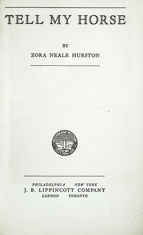First edition of Hurston's personal experiences in Haiti and Jamaica. Octavo, original cloth, pictorial endpapers, 26 illustrations. Near fine in a price-clipped good dust jacket with some wear and tear and tape repair to the back panel.