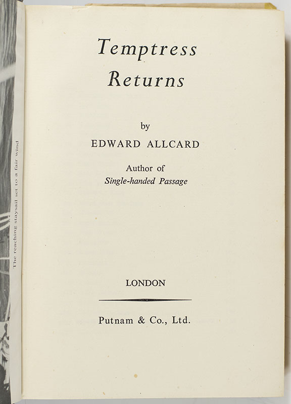Temptress Returns offers a detailed account of Allcard's second single-handed crossing of the Atlantic, this time crossing eastward. "Mr. Allcard has no small adventure to relate. But what was hardly to be expected was that he should tell the great tale so charmingly. There is something to please on every page" (The Field).