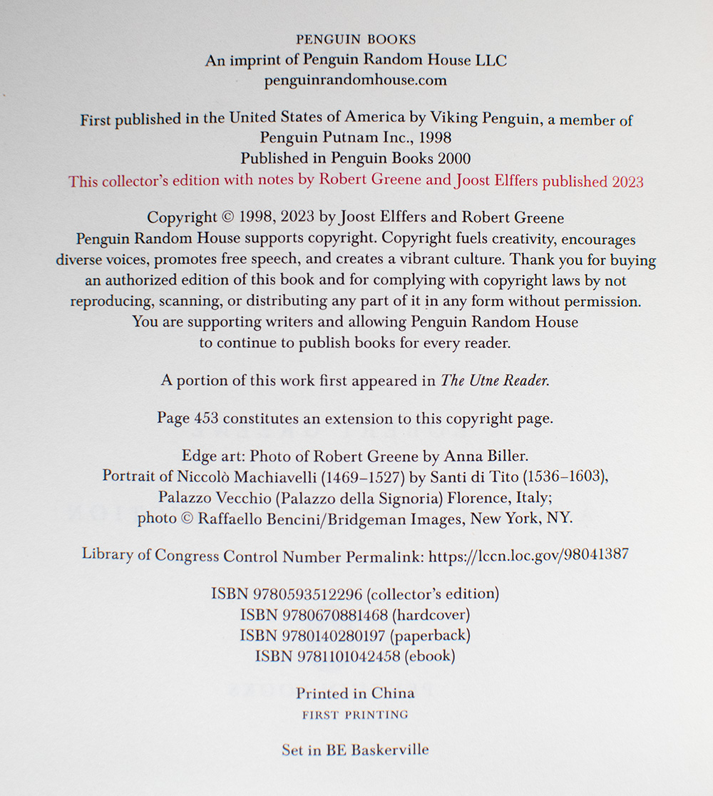 Special edition of the New York Times bestselling classic which has sold millions of copies worldwide. Octavo, original full vegan leather, gilt titles and tooling to the spine and front panel, gilded edges with a lenticular illustration of Robert Greene and Machiavelli, patterned endpapers. Boldly signed by Robert Greene on the half-title page. In fine condition. Introduction by Joost Elffers.