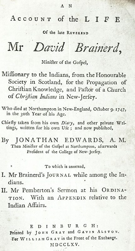 Early example of Jonathan Edwards' biography of american missionary David Brainerd; the most reprinted of all of Edwards' works