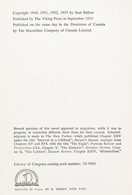First Edition of Saul Bellow's The Adventures of Augie March; Signed by Him