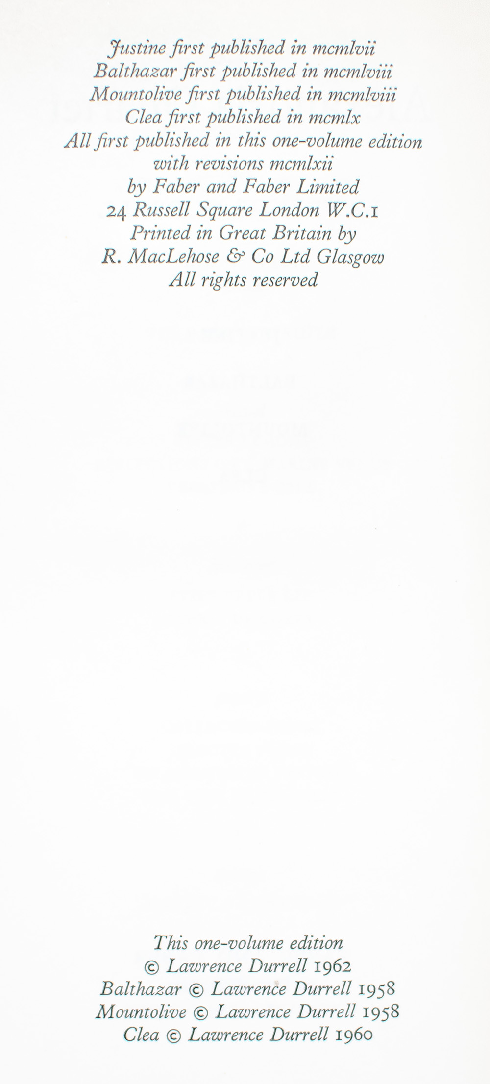 The Alexandria Quartet: Justine, Balthazar, Mountolive, Clea.