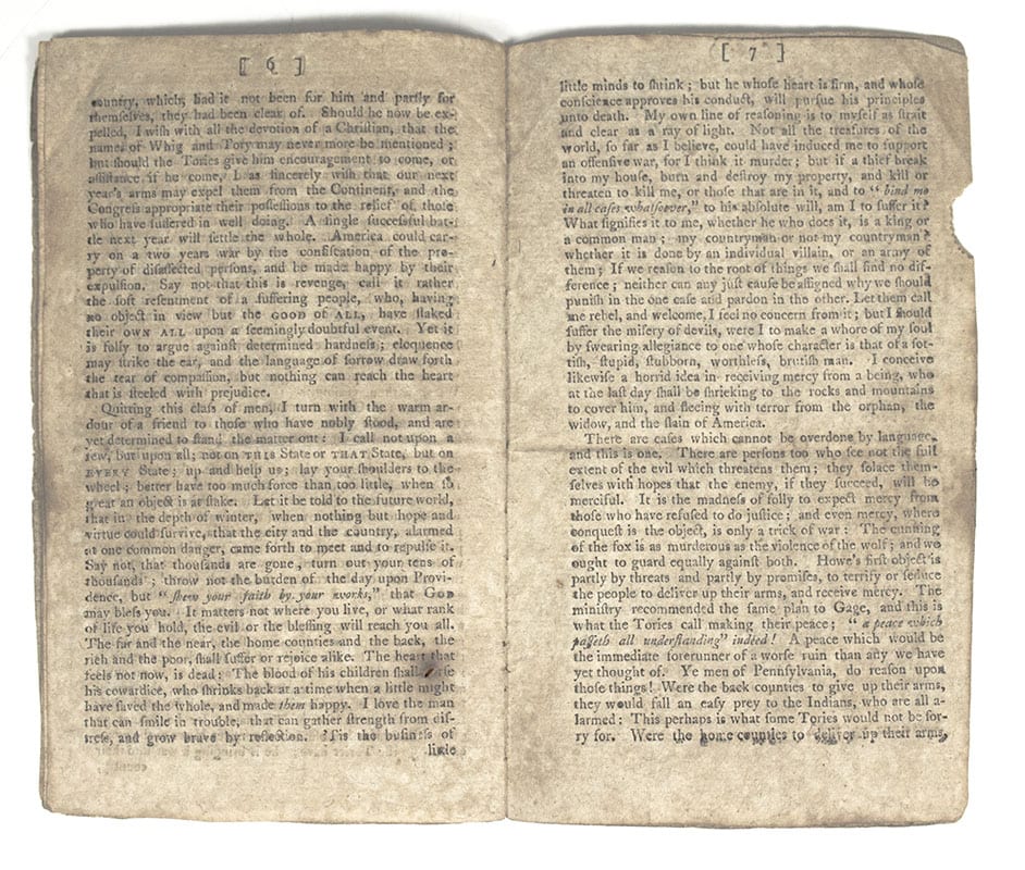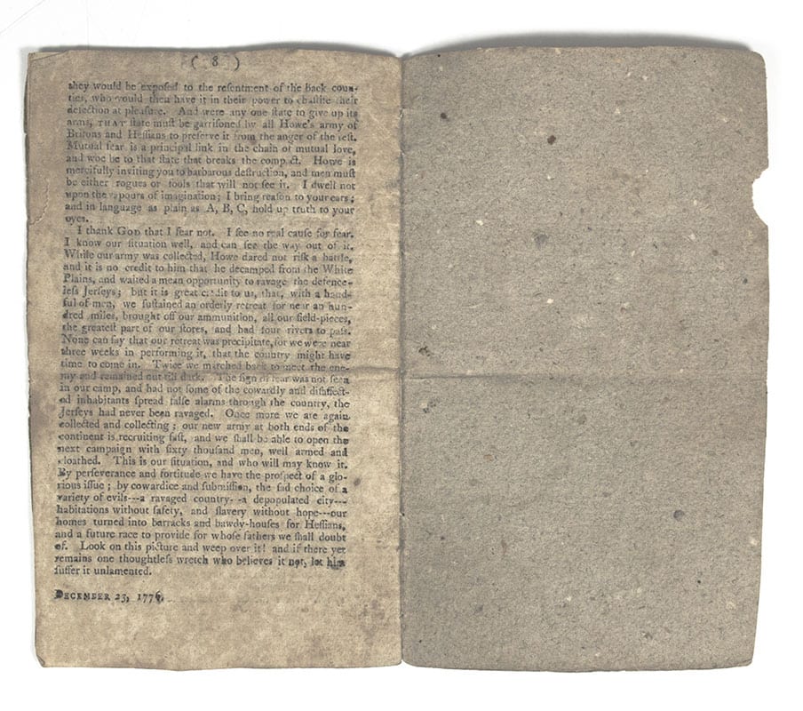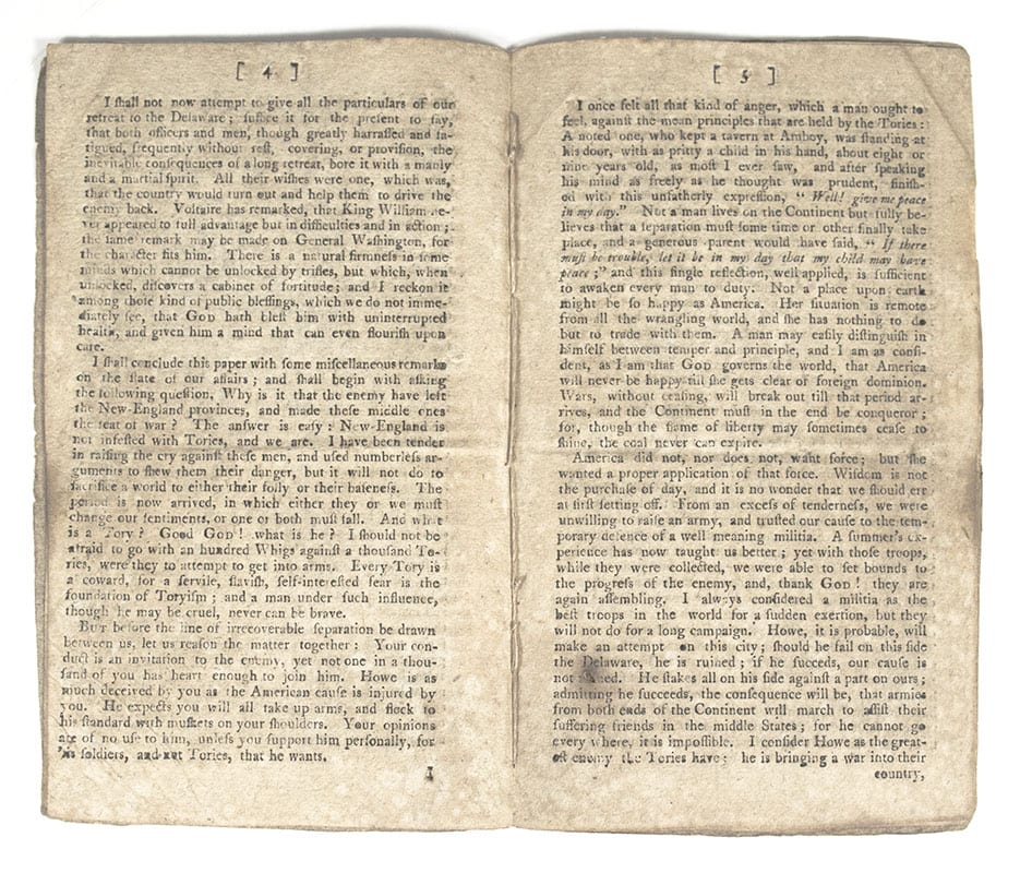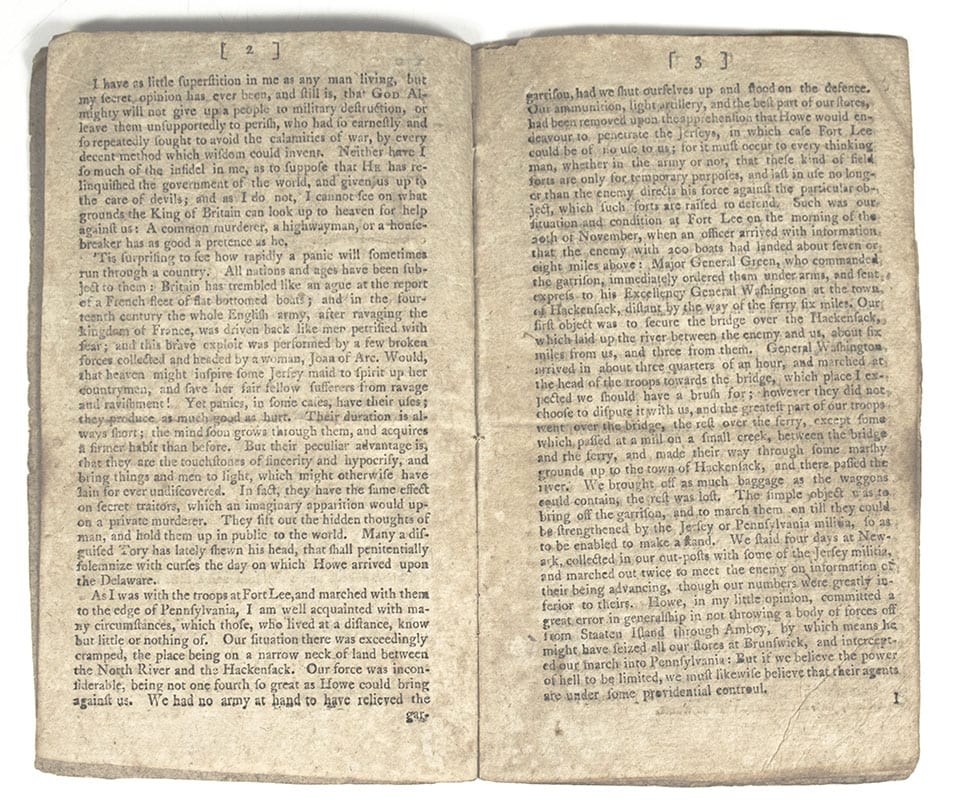 Exceptionally rare printing of Paine's famous call to arms was first published in the Philadelphia Journal on 19 December 1776, and then appeared in pamphlet form four days later, soon circulating through the major cities. It begins with the immortal words "These are the times that try men's souls: The summer soldier and the sunshine patriot will, in this crisis, shrink from the service of his country; but he that stands it NOW, deserves the love and thanks of man and woman. Tyranny, like hell, is not easily conquered, yet we have this consolation with us, that the harder the conflict, the more glorious the triumph. What we obtain too cheap, we esteem too lightly." This edition is dated "December 23, 1776" in type at the foot of the final page. It was advertised in printer Samuel Loudon's newspaper, the New-York Packet, on 6 February 1777 as "just published," and a thousand copies were ordered by the New York Constitutional Convention then in progress. Loudon had been a ship's chandler before launching his newspaper in January 1775. He fled the British army to Fishkill (in what is now Beacon) in mid-1776 and served as official state printer in addition to other projects.  The printer had fled NYC from the British and was also serving as the official printer of the NY government in exile up in Dutchess County. This copy was owned by Jonathan Thompson (1773-1846) of Islip, NY, who inscribed it in 1819. He later went on to be the customs collector for the Port of New York. "A Pair of Peripatetic Printers: The Up-State Imprints of John Holt and Samuel Loudon," in Essays Honoring Lawrence C. Wroth, page 397; Bristol B4323. 3 copies in ESTC. Octavo, original wrappers with the front panel with light dampstaining. Housed in a custom half clamshell calf and chemise box.