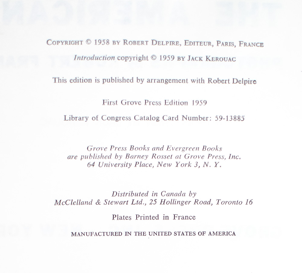 Jack Kerouac wrote in his preface of The Americans, "Robert Frank he sucked a sad poem out of America onto film, taking rank among the tragic poets of the world. To Robert Frank I now give this message. You got eyes." Frank’s Américains eventually achieved legendary status as "the most renowned photobook of all It struck a chord with a whole generation of American photographers Many memorable photobooks have been derived from this mass of material. None has been more memorable, more influential, nor more fully realized than Frank’s masterpiece" (Parr & Badger I:247). "From the more than 20,000 images that resulted, Frank eventually chose 83 of them and arranged them into four chapters ‘With these photographs,’ he later wrote, ‘I have attempted to show a cross-section of the American population. My effort was to express it simply and without confusion. The view is personal’ Such a simple intention for a book that would so alter the course of modern photography" (Roth, 150).