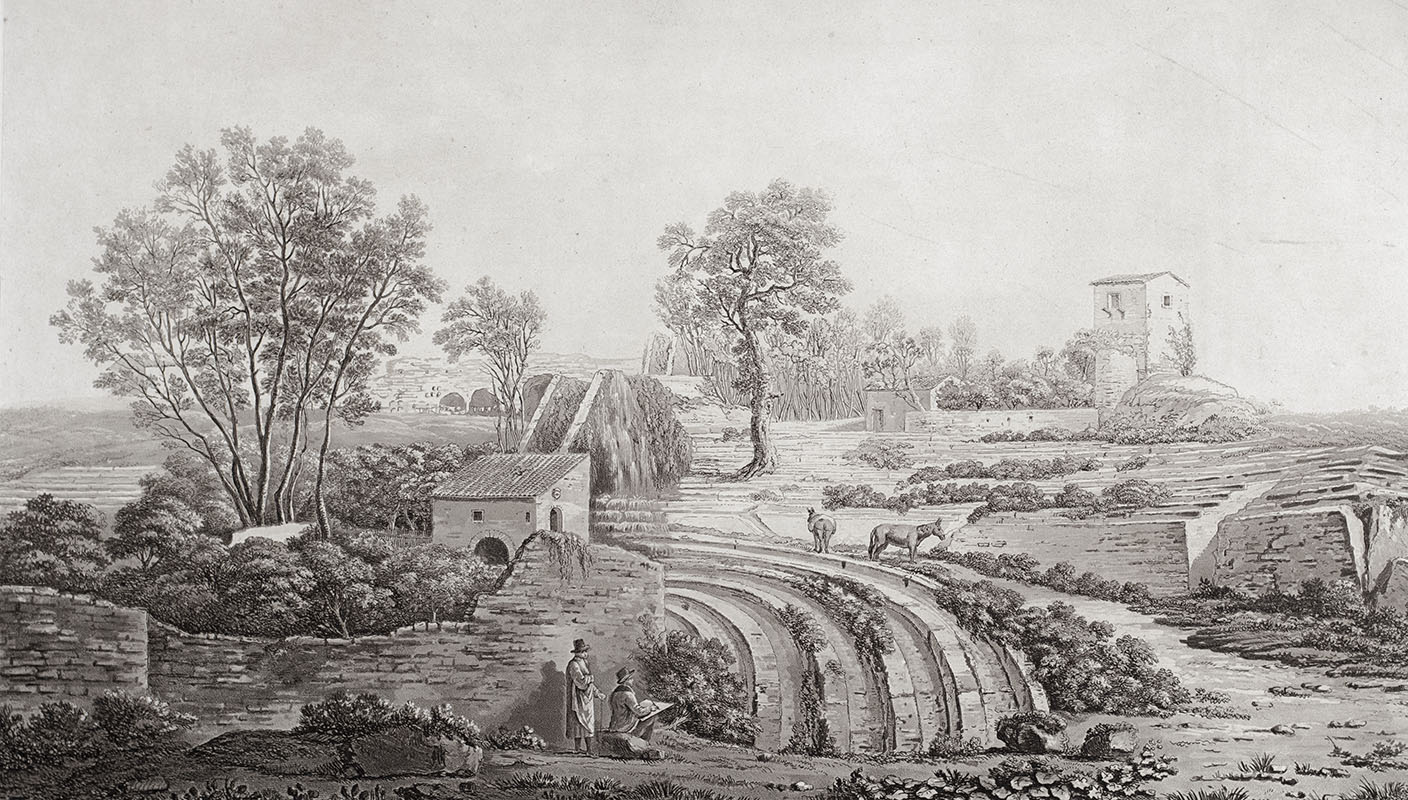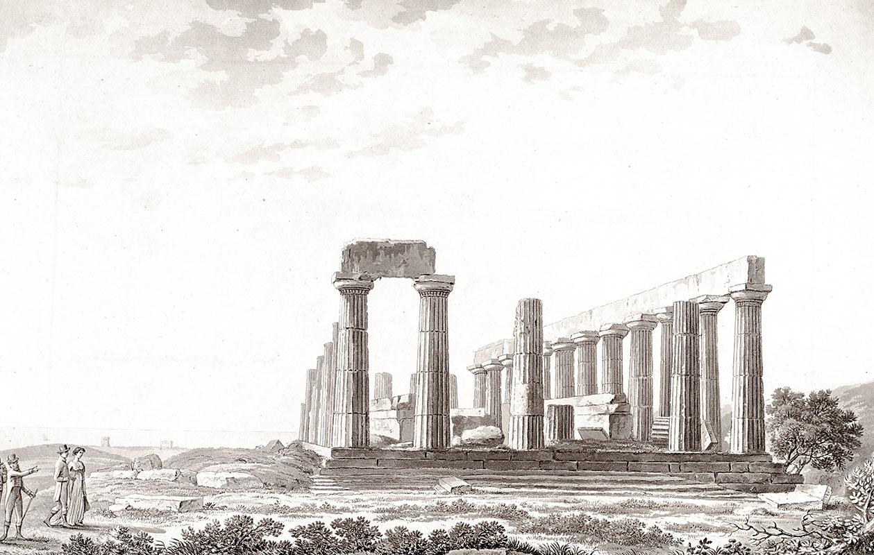 English architect and classical scholar William Wilkins visited the classical antiquities of Greece, Asia Minor, and Magna Græcia in Italy between 1801 and 1804. On his tour he was accompanied by Italian landscape painter Agostino Aglio, whom Wilkins had commissioned as a draughtsman on the expedition. Aglio supplied the drawings for the aquatint plates of monuments for Wilkins' impressive folio, The Antiquities of Magna Graecia.