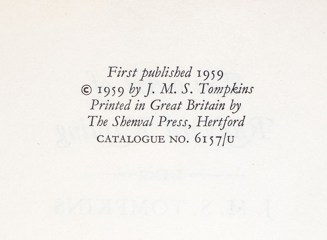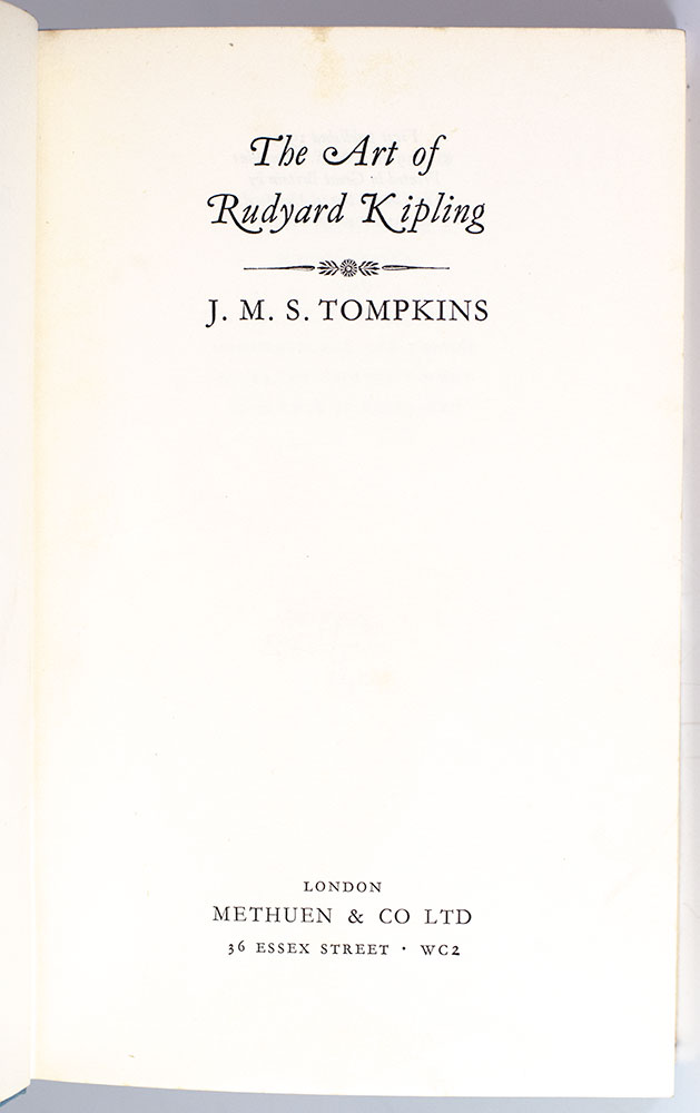 First edition of Tompkins' work on Kipling. Octavo, original cloth. Good in a very good price-clipped dust jacket. Stamps and tape remnants to the front and rear pastedowns.
