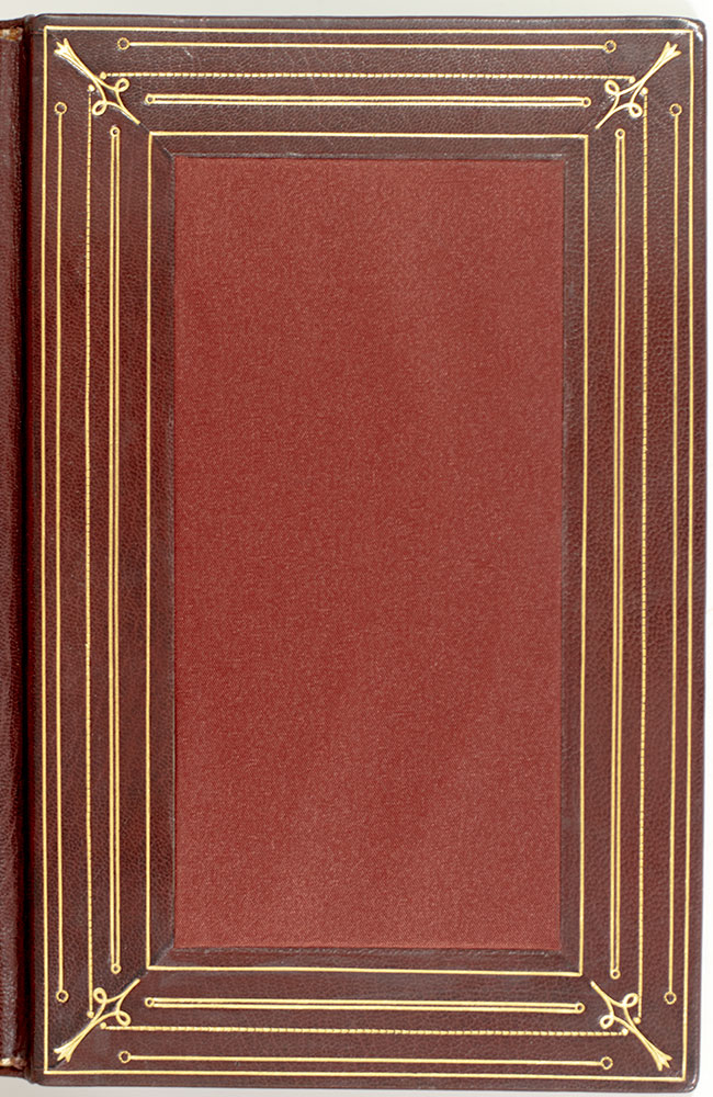 Cosway bindings (named for renowned 19th-century English miniaturist Richard Cosway) were popularized, if not invented, in the early 1900s by the renowned London bookselling firm of Henry Sotheran. The earliest Cosway bindings were created by Miss C.B. Currie who faithfully imitated Cosway's detailed watercolor style of portraiture from designs by J.H. Stonehouse, Sotheran’s manager. These delicate miniature paintings, often on ivory, were set into the covers or doublures of richly-tooled bindings and protected by a thin pane of glass.