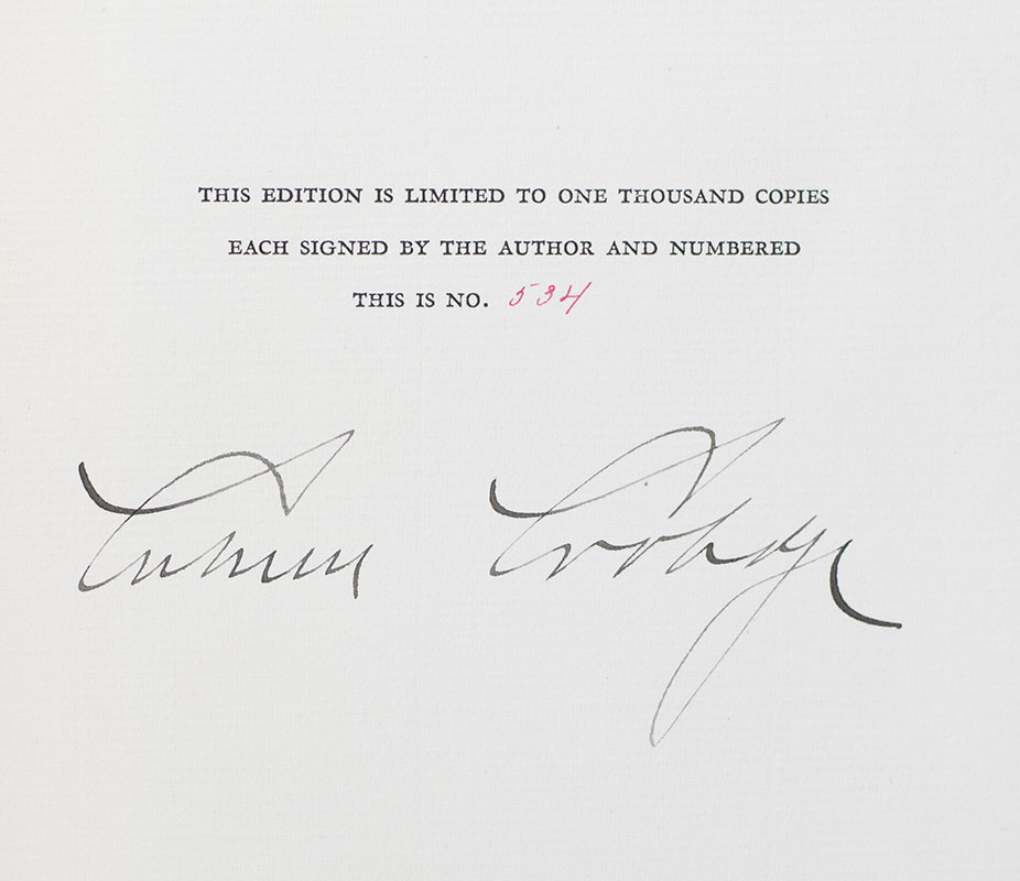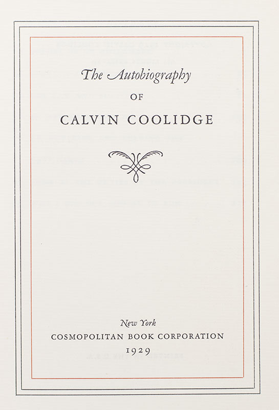 Signed limited first edition of the 30th President of the United States' autobiography. One of a 1,000 signed copies. Octavo, original quarter cloth, gilt topstain. In fine condition. Uncommon in this condition.