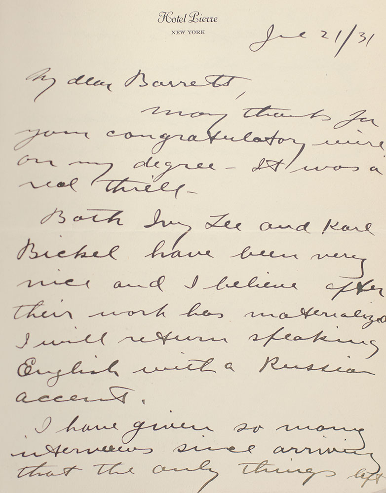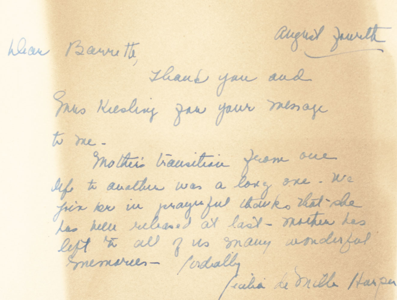 First edition of the autobiography of the legendary director. Octavo, original cloth. Note written on stationary from Hotel Pierre, New York, from Cecil B. De Mille to Barrett Kiesling, MGM Publicity Directory, dated June 21, 1931, laid-in, includes De Mille's signature. Two notes to Kiesling from Cecilia De Mille Harper (daughter of the famous director and an actress) also laid in, with her signature. Typed letter on Paramount Pictures Corporation letterhead from Cecil B. DeMille to Barrett C. Kiesling, with signature, affixed to the back pastedown (letter mentions Kiesling's help in writing the autobiography), dated May 14, 1958. Minor underlining on pages 249 and 260, where Kiesling is mentioned by name. Near fine in a near fine dust jacket. Jacket photograph by Yousuf Karsh. Edited by Donald Hayne. Rare and desirable signed and with noted provenance.