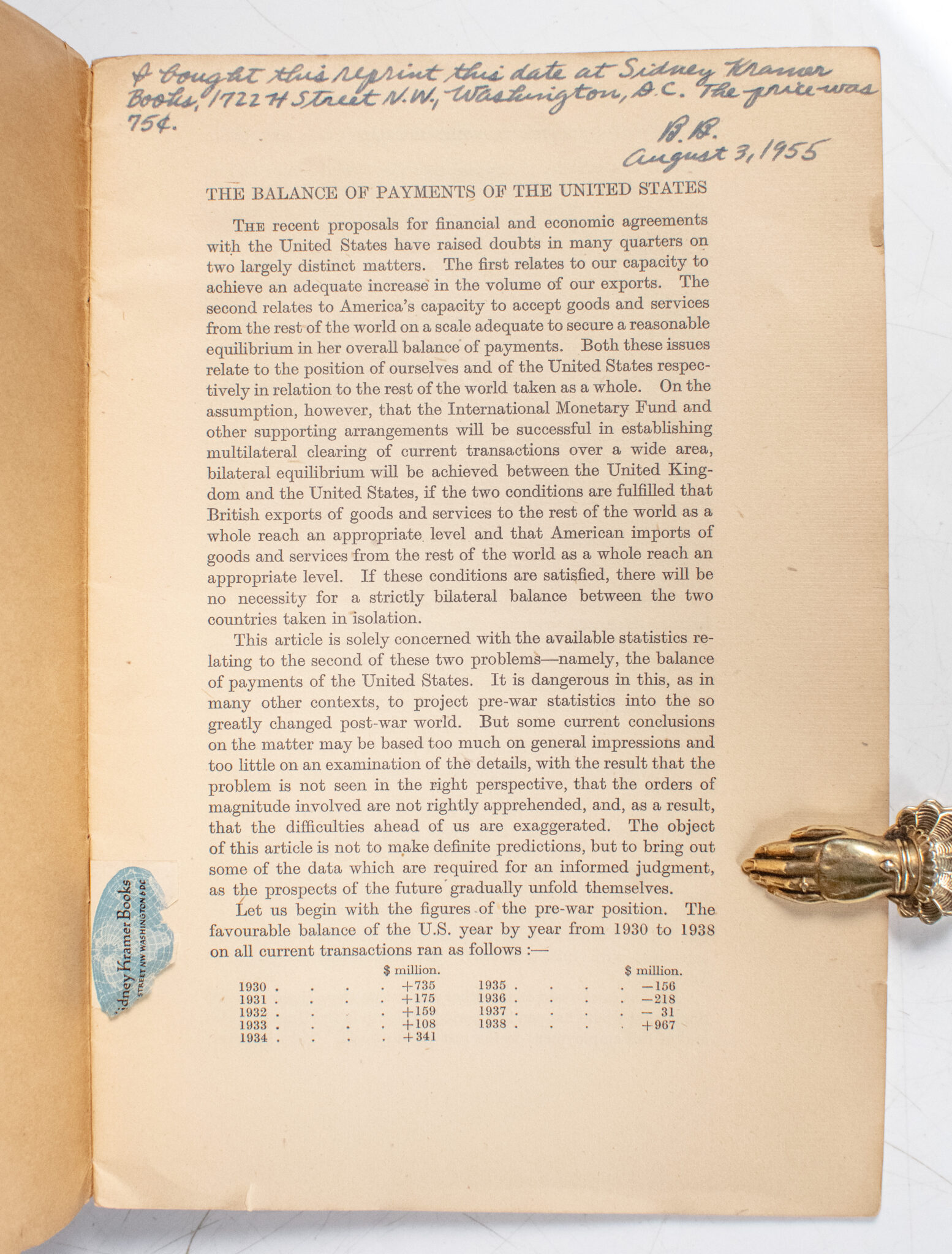 First Edition of John Maynard Keynes' The Balance of Payments of the United States