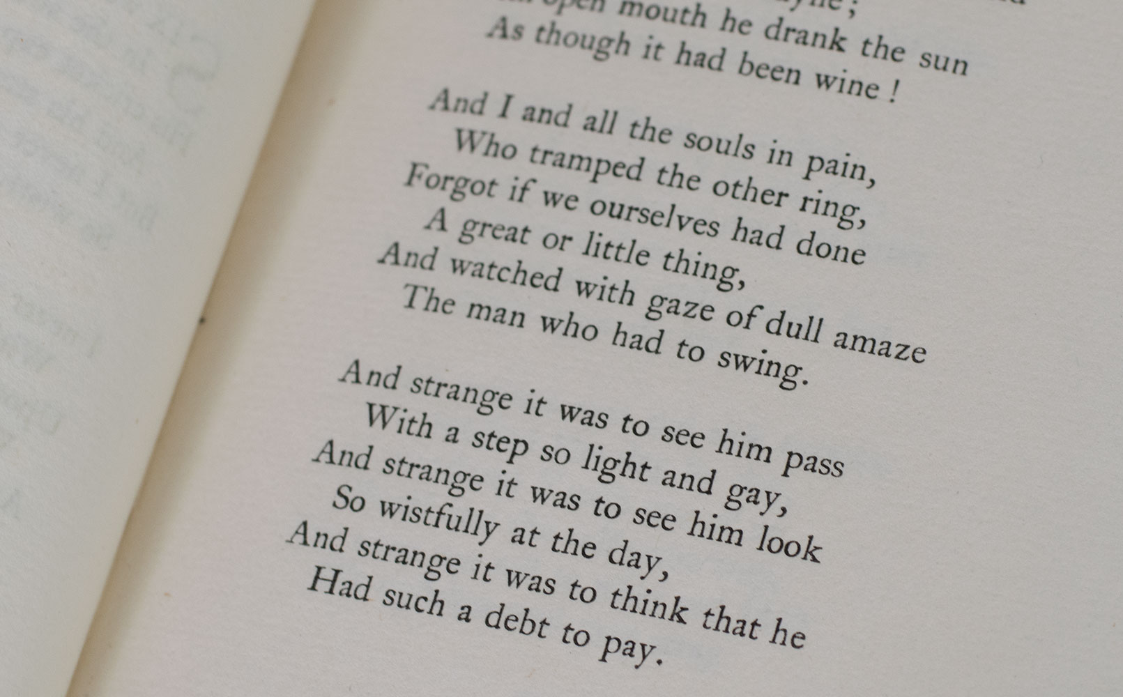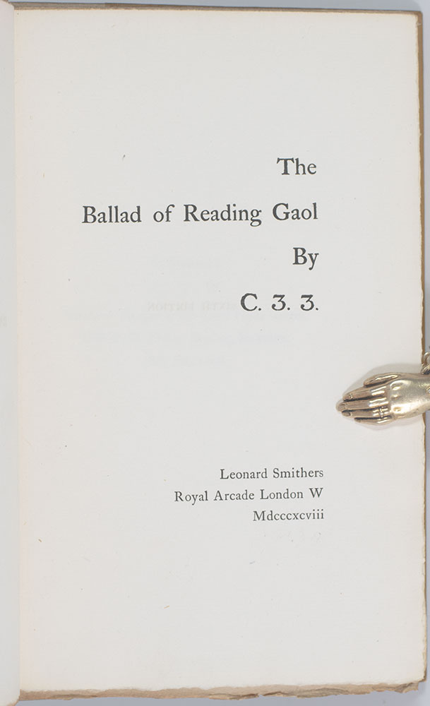 Inspired by his prison experience and comprised in part by a plea for penal reform, The Ballad of Reading Gaol was the last work Wilde completed before his death in 1900. “In his comedies the miscreants were always pardoned, but in the Ballad, while ultimately forgiven, they are treated vindictively by their fellows, who are equally guilty… There is no doubt that Wilde had once again touched a great subject and left his fingerprints on it… once read, it is never forgotten” (Ellmann, 532-34).