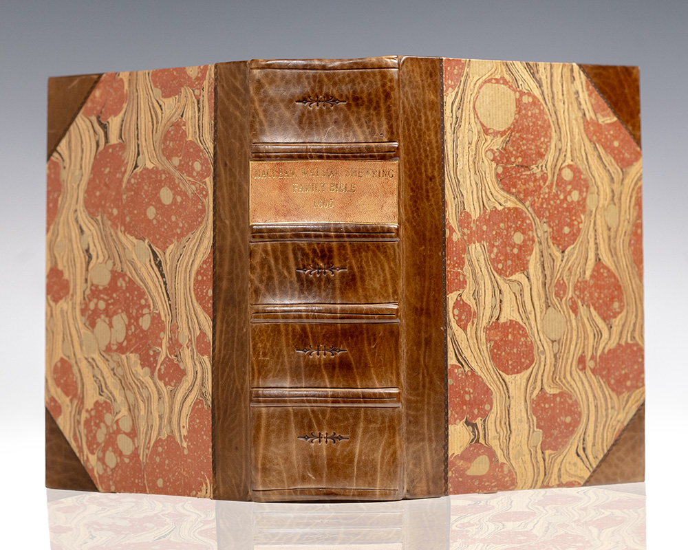 Rare early 17th century printing of Robert Barker’s Geneva Bible. Small quarto, bound in three quarter calf over marbled boards, morocco spine label lettered in gilt, text in black letter, double column, lacking general title-page, New Testament title-page with woodcut border, Concordances and Psalms bound in at rear [Herbert 280]. Period family ownership inscriptions and manuscript genealogies, intermittent staining, closed tear in P8, chipping to quire Q with loss to Q8, tears with loss of text to 2C2 (Job XIV-XVII), 2T3 (Daniel II-III), hole in side-note of 2R3, a few other marginal chips and tears. In very good condition.