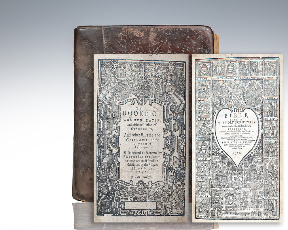 Rare "Breeches" Bible, printed by Christopher Barker with the fictitious 1599 publication date. "There are many editions bearing this date, which while agreeing closely are yet distinct ... the phenomena of the various editions described under the year 1599, and the very similar edition of 1633, constitute one of the most curious problems in the bibliography of the English Bible." Genesis 3:7 with "Then the eyes of them both were opened, and they knew that they were naked, and they sewed figge tree leaves together, and made themselves breeches." Octavo, two volumes bound into one in full paneled calf, hand-embossing to the front and rear panels, original silk and cloth ribbons, woodcut title pages and initials. Bound with The Booke of Common Prayer, and the Administration of the Sacraments, and Other Rites and Ceremonies of the Church of England printed by Robert Barker in 1636. In good condition, rebacked, contemporary names and inscriptions to several pages. A very rare and desirable example of the Breeches Bible.