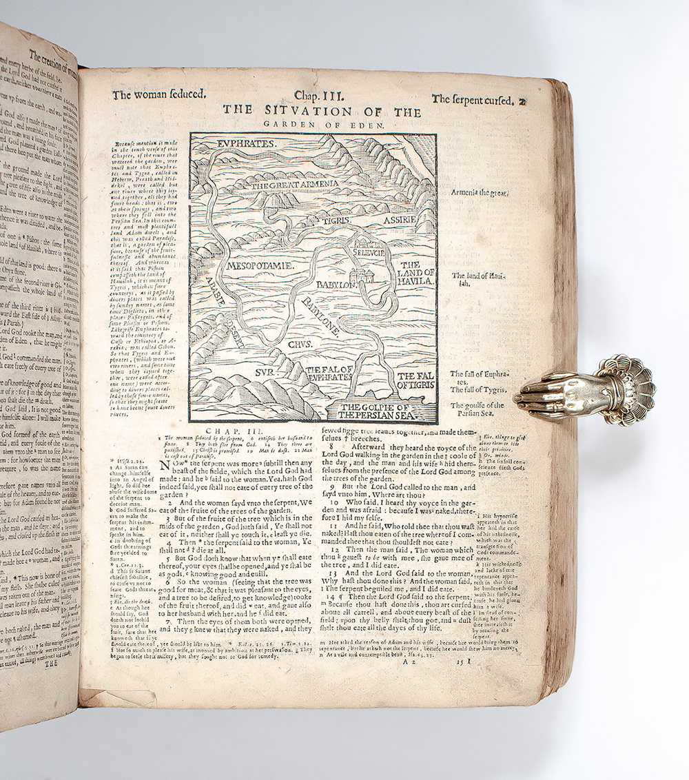 Upon Queen Mary’s accession in 1553, “publication of the English Bible ceased in England. Many Protestants who fled to the Continent were attracted to Calvin’s Geneva. Among these exiles were eminent English Bible scholars who began work on a new translation” (The Bible: 100 Landmarks 62). First published in 1560, the Geneva Bible—often called the “Breeches Bible” for its unique rendering of Genesis 3:7—was “more scholarly than any previous translation… [It] achieved immediate popularity and exerted an extremely powerful influence… The Geneva Version included prefaces, maps and tables; and for the first time in an English Bible the verses were divided and numbered… It has been more properly called the Elizabethan family Bible, since it was this version which was the first to enter the English home” (PMM 83). “It became the textus receptus for the Puritan element in England. It was read by Shakespeare, Bunyan and the soldiers of the Civil War, and is thus of cardinal importance for its influence on the English language, literature and thought” (Great Books and Book Collectors, 105-8).