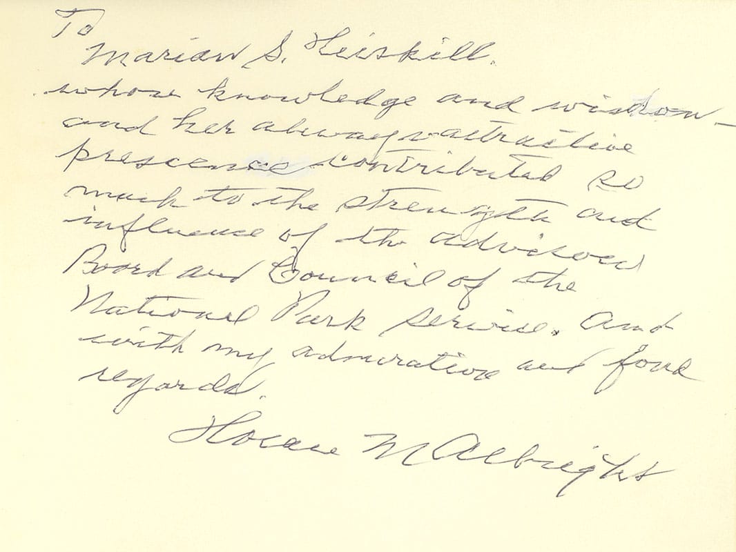 Created on August 25, 1916 by Congress through the National Park Service Organic Act, The National Park Service is charged with a dual role of preserving the ecological and historical integrity of the places entrusted to its management while also making them available and accessible for public use and enjoyment. Horace M. Albright worked closely with the National Park Service's first director Stephen Mather before serving as its second director. He later served as superintendent of Yellowstone National Park and, for a short time, Yosemite National Park. The nation's highest civilian award, the Presidential Medal of Freedom, was awarded to Albright by President Jimmy Carter on the 64th anniversary of the National Park Service.