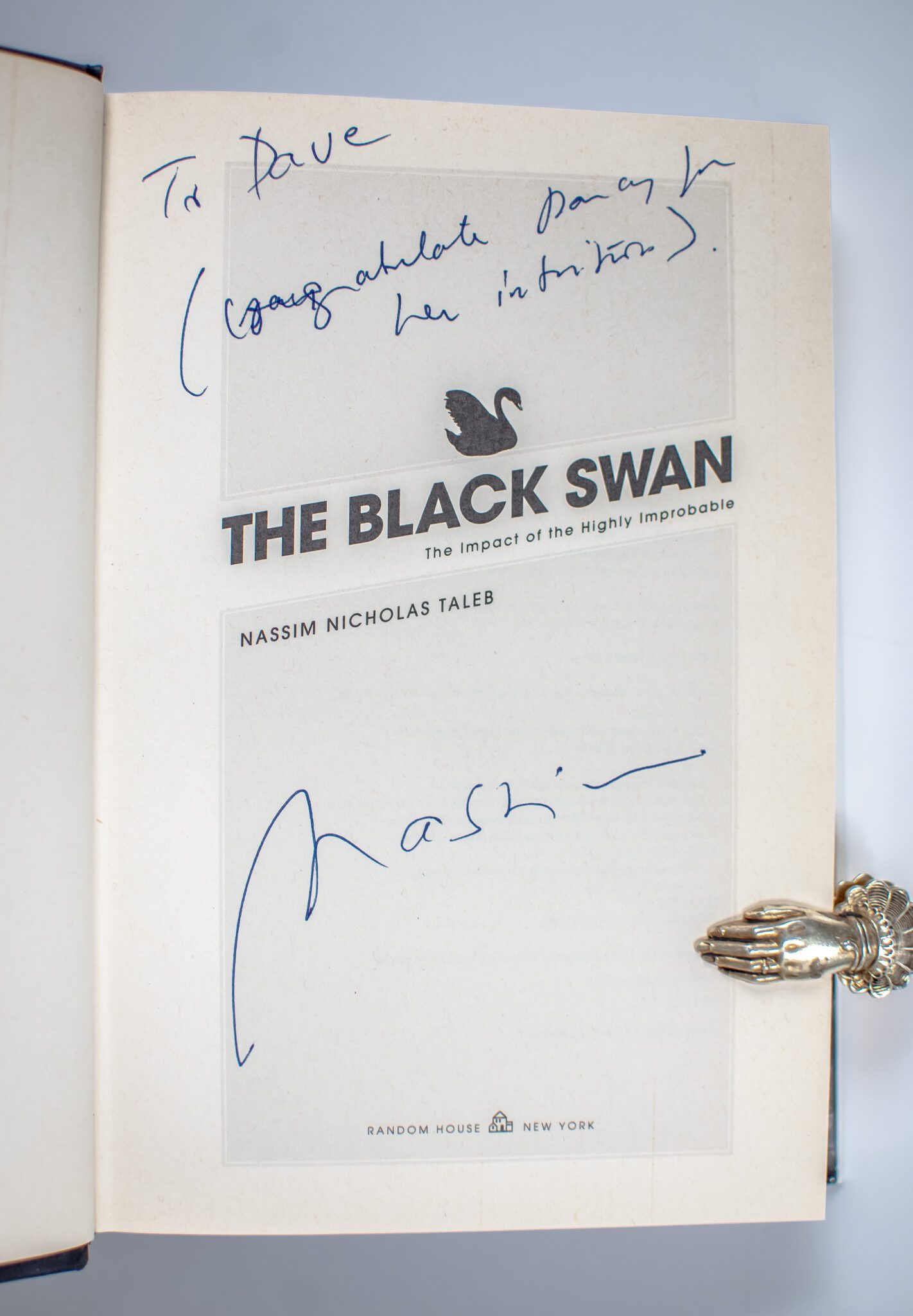 First edition, later printing of this work concentrating on outlier events. Octavo, original boards. Presentation copy, inscribed by Nassim Nicholas Taleb on the title page, "To Dave (congratulate Dana for her intuition). Nassim." Near fine in a near fine dust jacket with light toning and bumping, light pen mark to the front panel of the dust jacket. Jacket design by Thomas Beck Stvan. Jacket art by Photodisk/ Getty Images.