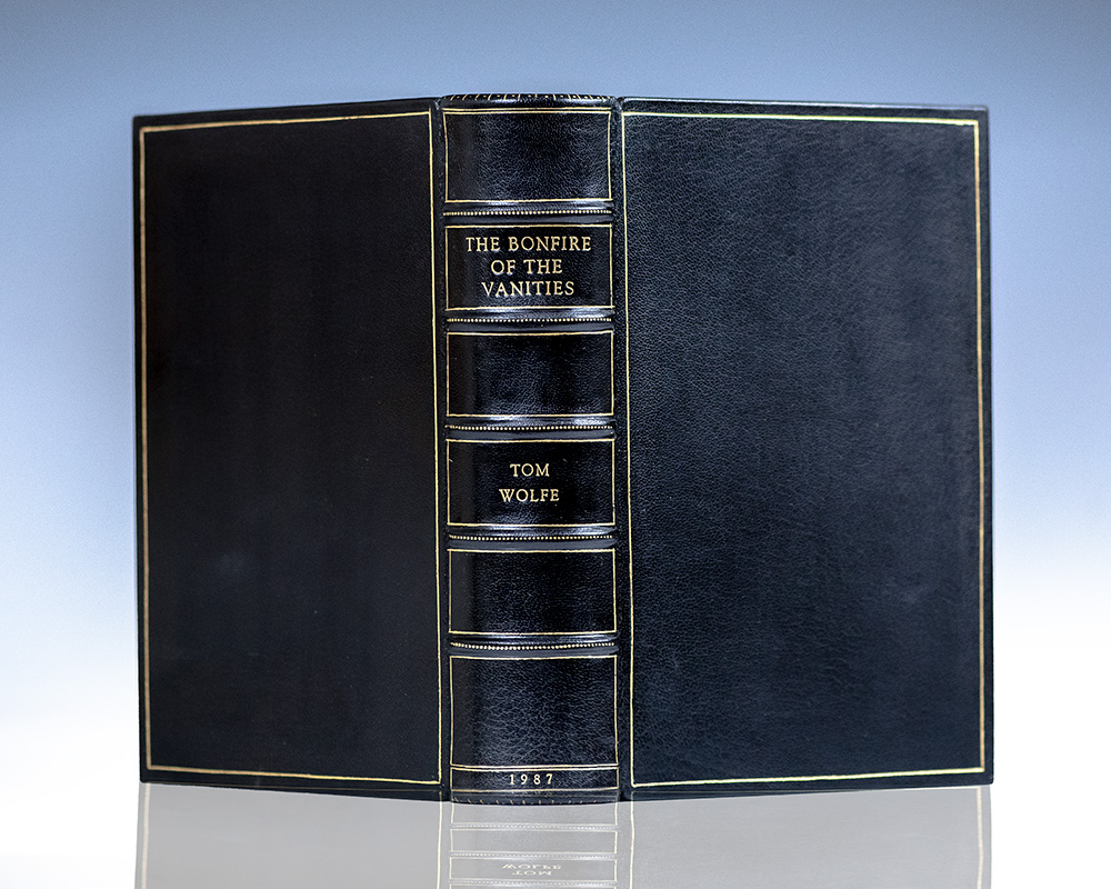 First edition of the author's first novel, basis for the film starring Academy Award-winning actor Tom Hanks. Octavo, bound in full morocco by the Harcourt Bindery with gilt titles and tooling to the spine in five compartments within raised gilt bands, gilt ruling to the front and rear panel, gilt inner dentelles stamp-signed by the Harcourt Bindery, marbled endpapers, all edges gilt. Boldly signed by Tom Wolfe and Academy Award-winning actor Tom Hanks on a page bound in. In fine condition. Rare and desirable.