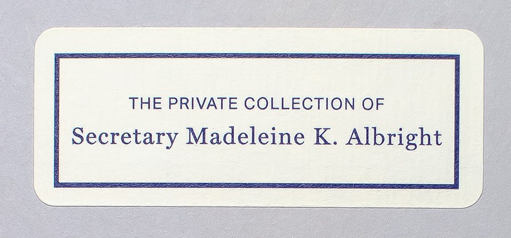 Second printing of the author's first novel. Octavo, original publisher's half cloth, bookplate to the front pastedown from “The Private Collection of Secretary Madeleine K. Albright.” The collector, Madeleine K. Albright, was the first woman to serve as the U.S. Secretary of State. She acted under President Bill Clinton from 1997 to 2001, leading the United States through foreign policy in the Middle East with the endorsement of military action in Iraq. At the 1998 NATO summit, Albright coined the “3 Ds” of NATO, “which is no diminution of NATO, no discrimination and no duplication – because I think that we don’t need any of those three “Ds” to happen.” After her tenure as Secretary of State, she served as chair of the consulting Albright Stonebridge Group and was the Michael and Virginia Mortara Endowed Distinguished Professor in the Practice of Diplomacy at Georgetown University’s School of Foreign Service. For Albright’s contributions to foreign policy and relations that defined a century, President Barack Obama awarded her the Presidential Medal of Freedom in 2012. Near fine in a near fine price- clipped dust jacket. Jacket design by Fred Marcellino.