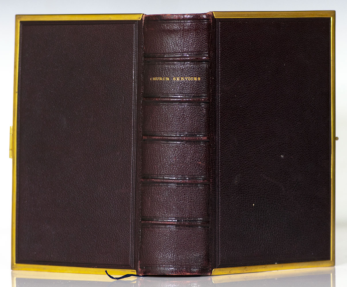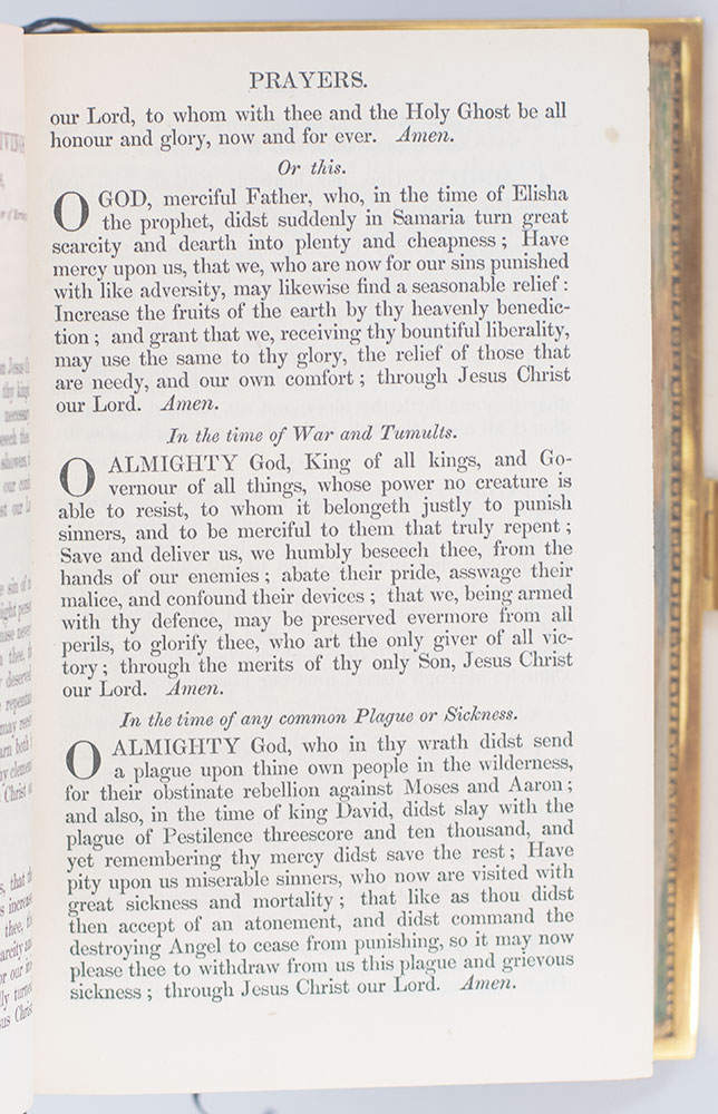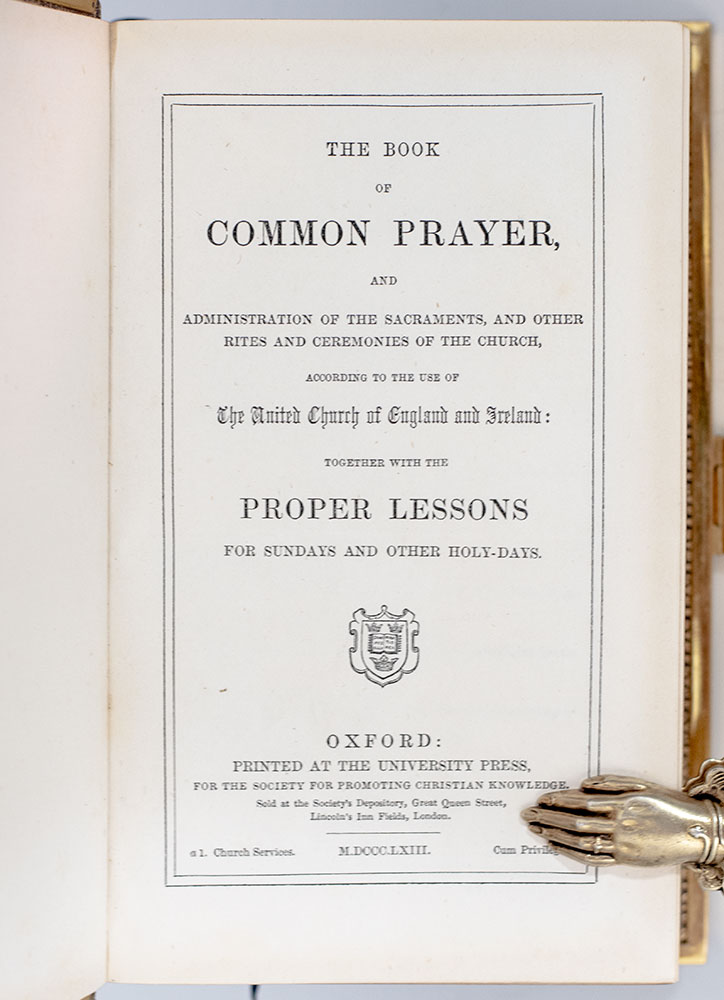 Finely bound Oxford University printing of the Book of Common Prayer and Administration to the Sacraments decorated with a double disappearing fore-edge painting. Small octavo, bound in full pebbled morocco with gilt titles to the spine, gilt inner dentelles, brass reinforced board edges and clasp, ribbons bound in, all edges gilt with a double disappearing fore-edge painting revealing two intricately painted Biblical scenes. In near fine condition. A very unique example.