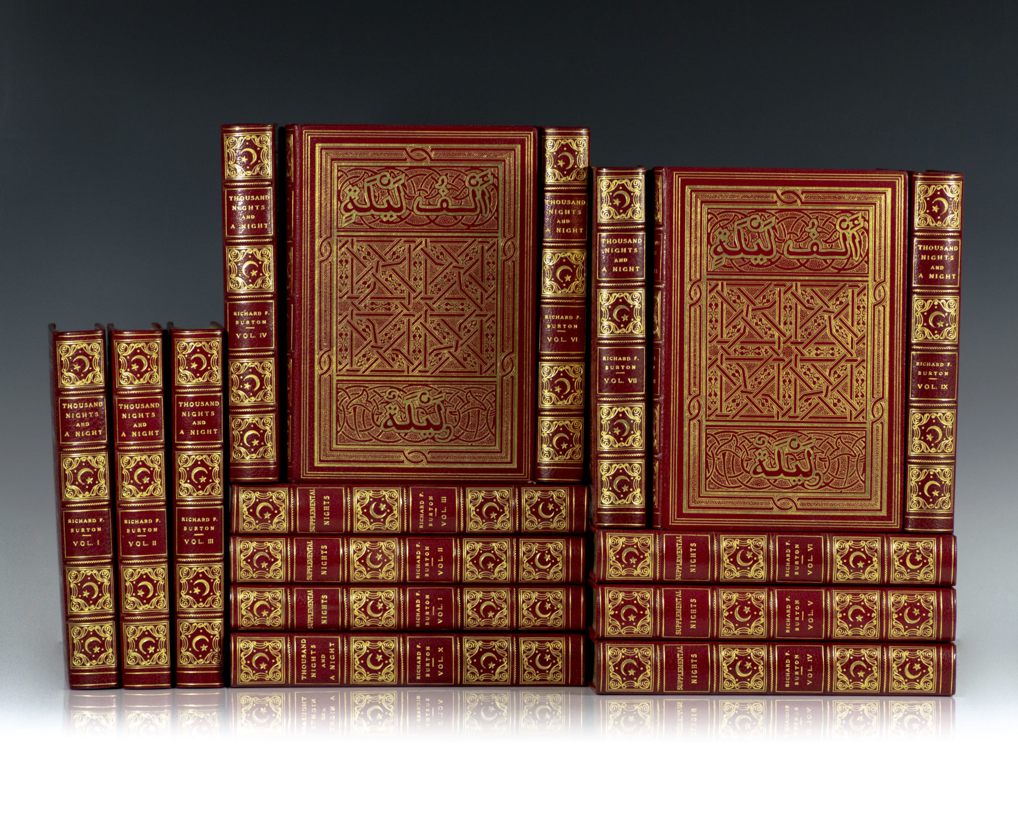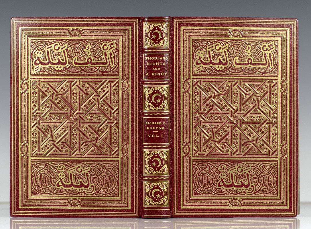 The manuscript edition of Burton's great work. Quarto, 16 volumes, original full red morocco with gilt titles and tooling to the spine in six compartments within raised gilt bands, elaborate ornamental arabesque decorations to the front and rear panels within triple gilt ruling, gilt turn-ins and inner dentelles, marbled endpapers, top edge gilt with others uncut, title pages printed in red and black, photogravure frontispieces in 2 states, illustrated with photogravure plates with red-captioned tissue-guards. One of ninety-nine numbered sets, this is number 41. In fine condition. This set is without the leaof manuscript included in this edition. An exceptional set.