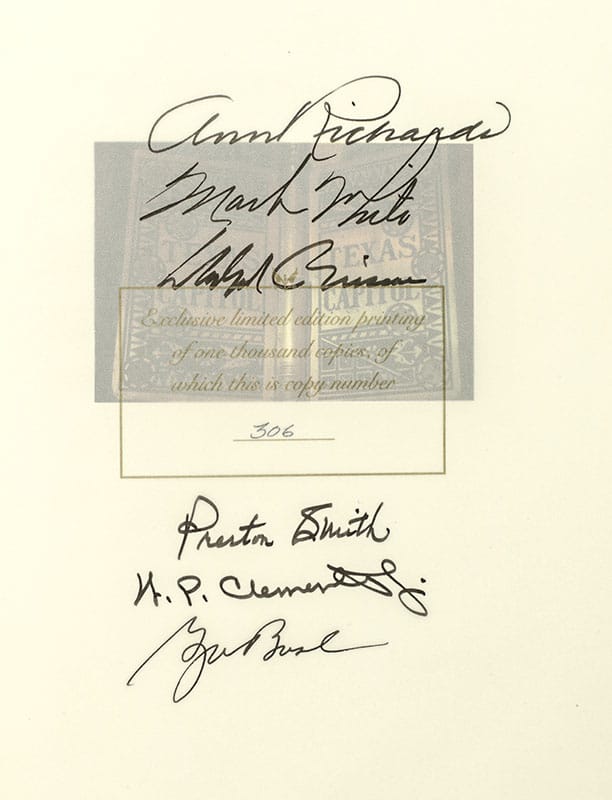 Signed limited first edition of work on Austin, Texas. Quarto, bound in full leather, illustrated throughout, original slipcase. Signed by six Texas Governors including George W. Bush. At the time of the publication of this book George W. Bush was Governor of Texas. Signed in order from top to bottom of page: Ann Richards, Mark White, Dolph Briscoe, Preston Smith, W. P. Clements, and George W. Bush. This special edition was limited to 1000 copies of which this is 306. Fine in a fine slipcase.