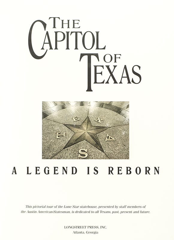 The Austin American Statesman newspaper issued this book shortly after the restoration of the Capitol in 1995. Part of the proceeds from the sale went to the restoration fund. A news article appeared in the Austin American Statesman newspaper on April 20, 1995 notifying the public that these “special limited editions, leather bound and signed by Gov. George Bush and his five predecessors.” were available. The books sold out quickly and are now quite rare and sought after since Bush was elected as U. S. President.