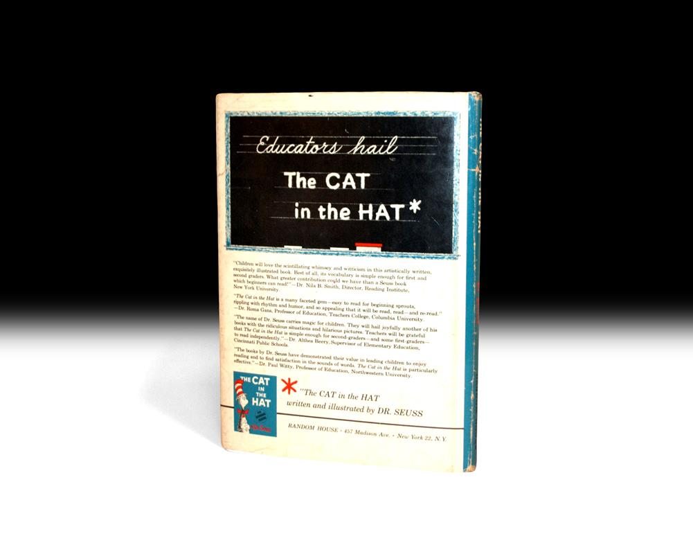 First edition, first issue, octavo, original illustrated unlaminated boards. Inscribed by the author, "For Sandra Robertson Best Wishes to a fascinating girl who loves cats from Dr. Seuss (and the cat)". Boards slightly rubbed as usual else near fine in an excellent dust jacket that shows minor wear to the extremities. All issue points present: price of 200/200 on the dust jacket, no mention of the "Beginner Books" series on the rear panel, and has four paragraphs of educator's reviews on rear panel. Book contains a single signature and 61 pages with a message on final page before end paper contained in an outline of the cat's hat & head. Housed in a custom half morocco clamshell box.