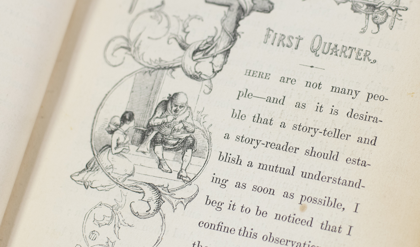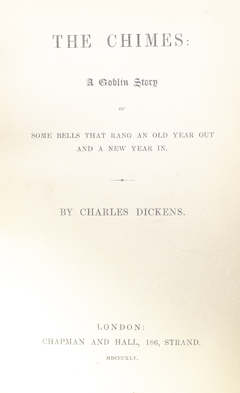 First editions of the four final novellas in Charles Dickens’ Christmas Book series. Octavo, 4 volumes bound in three quarter morocco over marbled boards with elaborate gilt tooling to the spine in six compartments within raised gilt bands, morocco spine labels lettered in gilt, marbled endpapers, top edge gilt. The set is comprised of a first edition of The Chimes [London: Chapman & Hall, 1845 (1844)] Half-title and 13 illustrations, including frontispiece and vignette title, by Daniel Maclise, Richard Doyle, John Leech and Clarkson Stanfield. Second state of the vignette title; First edition of The Cricket on the Hearth [London: Bradbury & Evans, 1846 (1845)] Half-title and 14 illustrations, including frontispiece and vignette title, by Leech, Doyle, Stanfield, Maclise and Edwin Landseer; 2 pp. advertisements at rear (second state); first edition of The Battle of Life[ London: Bradbury & Evans, 1846] Half-title, 13 illustrations, including frontispiece and vignette title, by Maclise, Doyle, Leech and Stanfield, fourth state of the vignette title, 2pp. advertisements at rear, fourth state of vignette title; first edition of The Haunted Man and the Ghost's Bargain [London: Bradbury & Evans, 1848] with 17 illustrations, including frontispiece and vignette title by Leech, Stanfield, Tenniel and Stone. In very good condition.