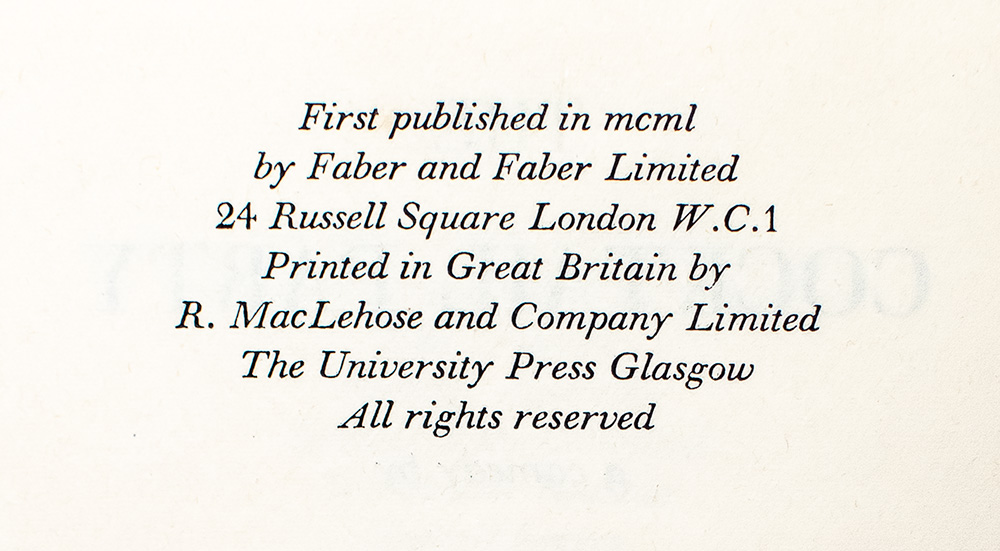First edition of the most popular of Eliot's seven plays published during his lifetime. First issue with "here" for "her" on page 29, line 1. Octavo, original cloth. Presentation copy, inscribed by the author before publication on the front free endpaper, "To Christopher Sykes With the author's humble compliments. T.S. Eliot 27.II.50." The recipient, Christopher Sykes was a fellow writer, who was known for his non-fiction work biography on his friend Evelyn Waugh. Sykes learned Persian studies in 1933 before travelling in Central Asia during 1933–34 with Robert Byron, who later wrote The Road to Oxiana recounting their long expedition in what was then a country almost unexplored by Western Europeans. In the book, Byron states that Sykes was given an order to leave Persia, but that after negotiations had been carried out, he was able to depart freely from the country, via Afghanistan, in Byron's company. After returning to England, Sykes and Byron wrote a novel together under the name of Richard Waughburton, Innocence and Design, published in 1935. A little later, Sykes and Cyril Connolly planned a book with the title of The Little Voice. In common with other projects of Connolly's, the book never got beyond the planning stages. Sykes published in 1936 a biography of the German Persianist Wilhelm Wassmuss; he did not, during later years, include this volume in his list of his publications. A memoir of Byron, killed at sea in 1941, was included in Sykes' best-selling book, Four Studies in Loyalty. Near fine in a near fine dust jacket, bookplate to the front pastedown.