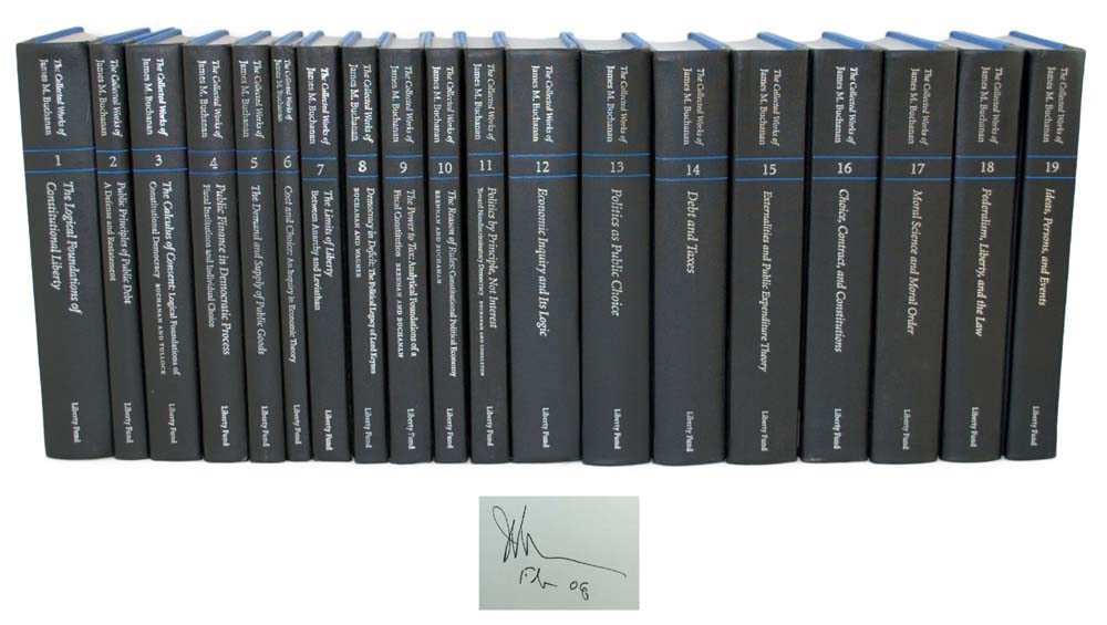 First editions of each of volume that comprise the collected works of Nobel Prize-winning economist James M. Buchanan's papers. Each volume is signed and dated by James M. Buchanan. Octavo, original half cloth, 19 volumes. In fine condition, dust jackets were not issued for these volumes.