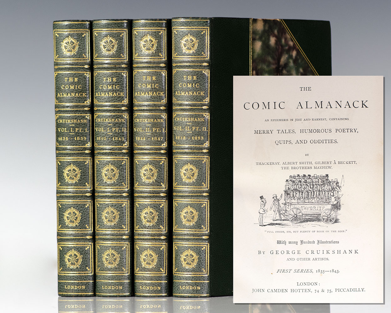 First editions of the first and second series of The Comic Almanack; illustrated by George Cruikshank. Octavo, four volumes, bound in three quarters morocco over marbled boards by Root & Son, gilt titles and tooling to the spine in six compartments within raised gilt bands, marbled endpapers, all edges gilt, ribbon bound in, with many illustrations by George Cruikshank and other Artists. In near fine condition.