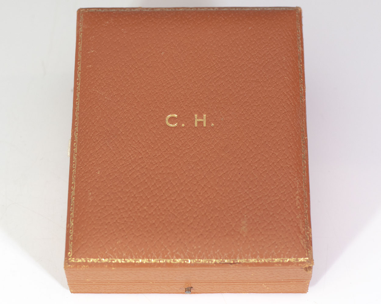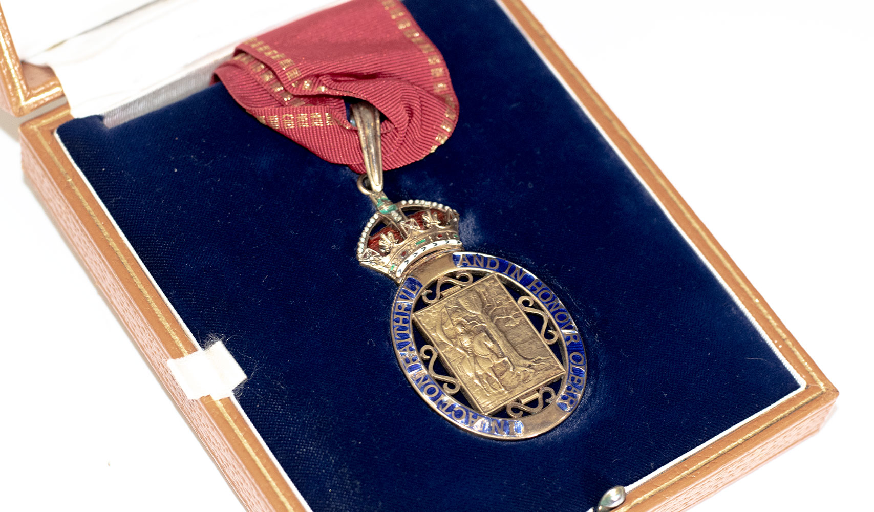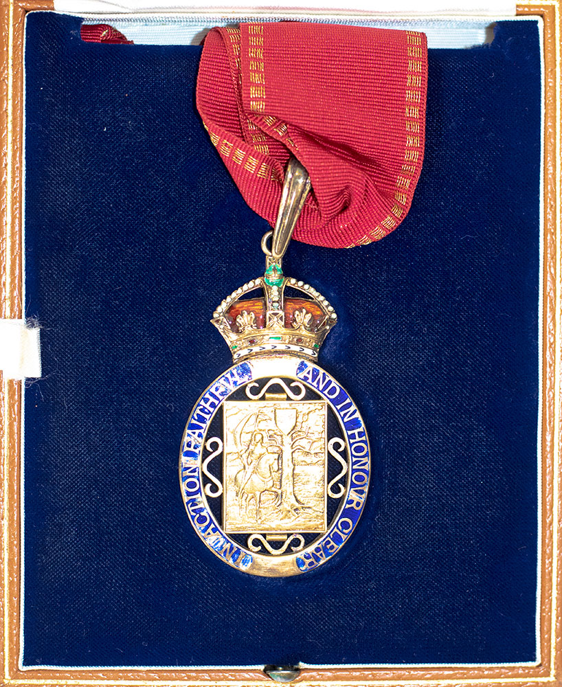 Exquisite Companion of Honour Medal, awarded by Queen Elizabeth II to Friedrich von Hayek on June 16th 1984 at Buckingham Palace. Measuring 2.5 inches by 1.75 inches, the medallion is surmounted by the royal crown decorated in red and green enamel and features a mounted knight and oak tree with the shield of the Royal Arms of the United Kingdom within a blue oval frame bearing the gilt motto, "In Action Faithful and In Honor Clear." On the verso is Queen Elizabeth's royal insignia. Presented on a red ribbon with gold thread borders and housed in a custom velvet blue and silk lined full morocco clamshell box. In fine condition.