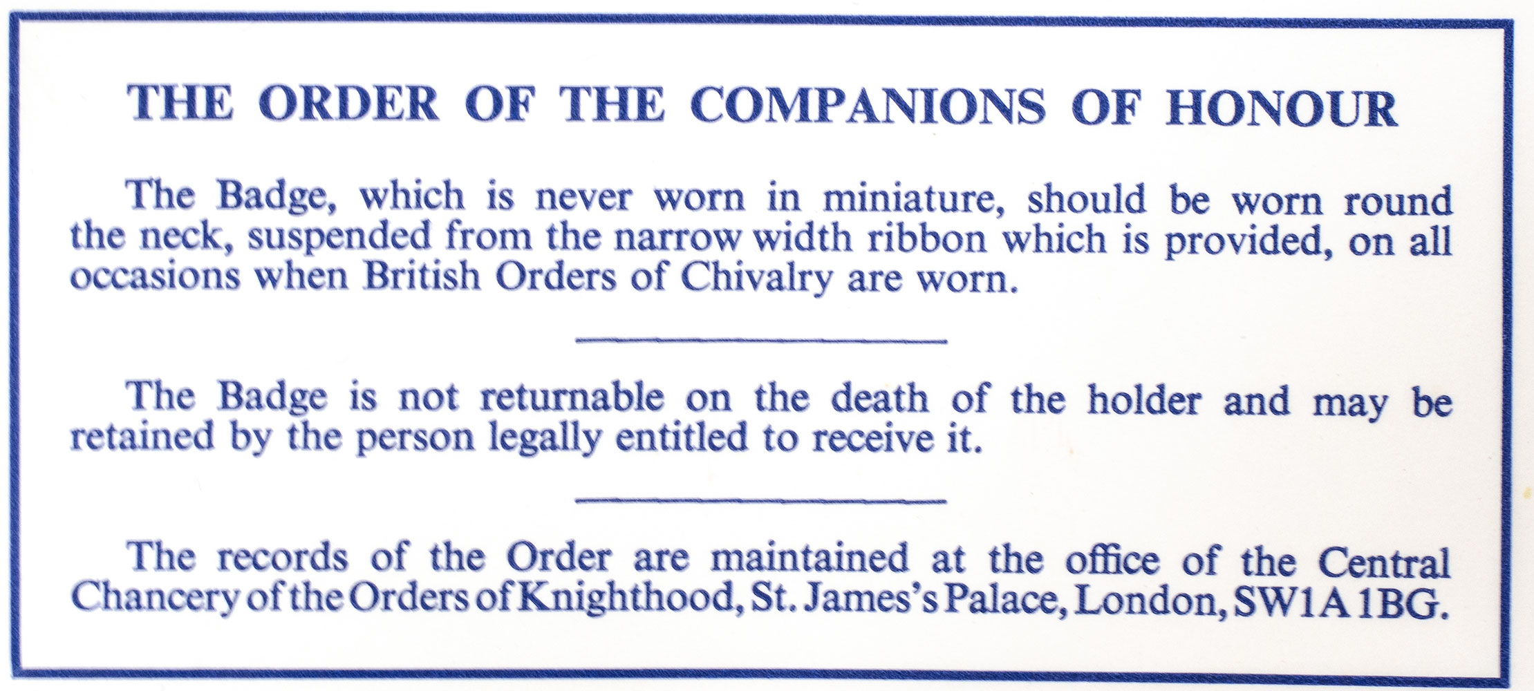 The Order of the Companions of Honour was established by King George V on June 4th 1917 as a reward for outstanding achievements to be "conferred upon a limited number of persons for whom this special distinction seems to be the most appropriate form of recognition, constituting an honour disassociated either from the acceptance of title or the classification of merit." Hayek was appointed a Companion of Honour in the 1984 for his “services to the study of Economics”. The appointment was attended by a 20 minute audience with the Queen followed by dinner at the Institute of Economic Affairs. That evening, after the festivities, Hayek is reported to have said “I’ve just had the happiest day of my life.”