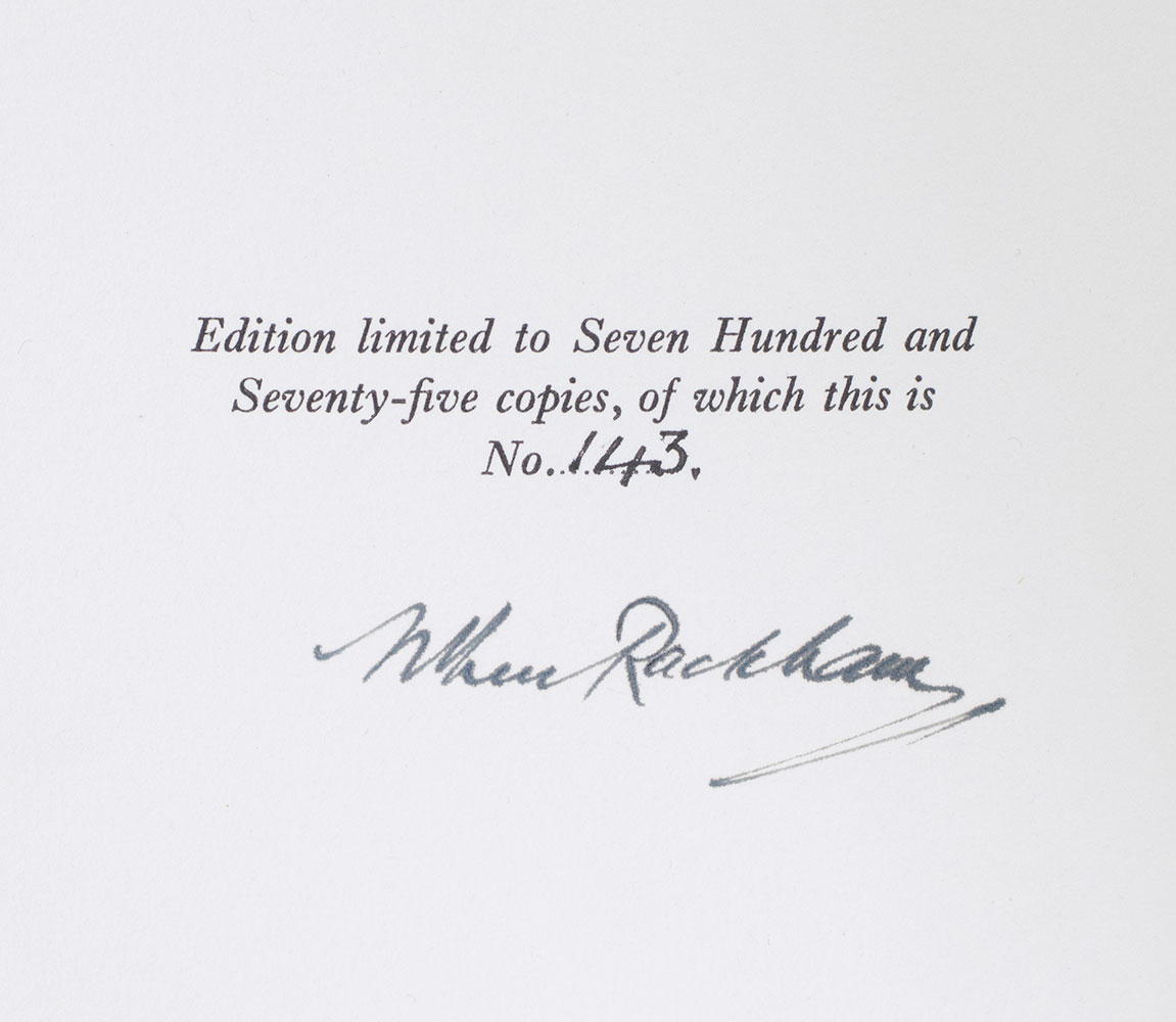 Deluxe signed limited edition of Arthur Rackham's wonderfully illustrated rendition of The Compleat Angler. Quarto, original publisher's full vellum decorated in gilt, pictorial endpapers, illustrated by Arthur Rackham with 12 full-page color plates and 25 in-text line cuts. One of seven hundred and seventy-five numbered copies signed by Arthur Rackham, this is number 143. In fine condition. An exceptional example.