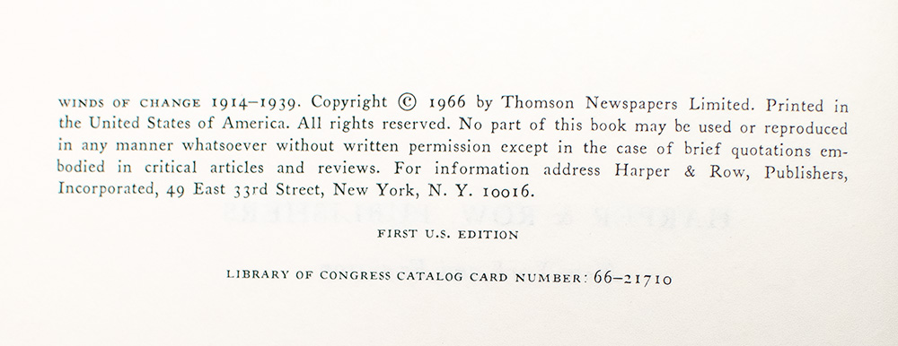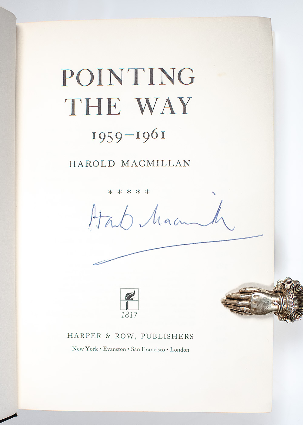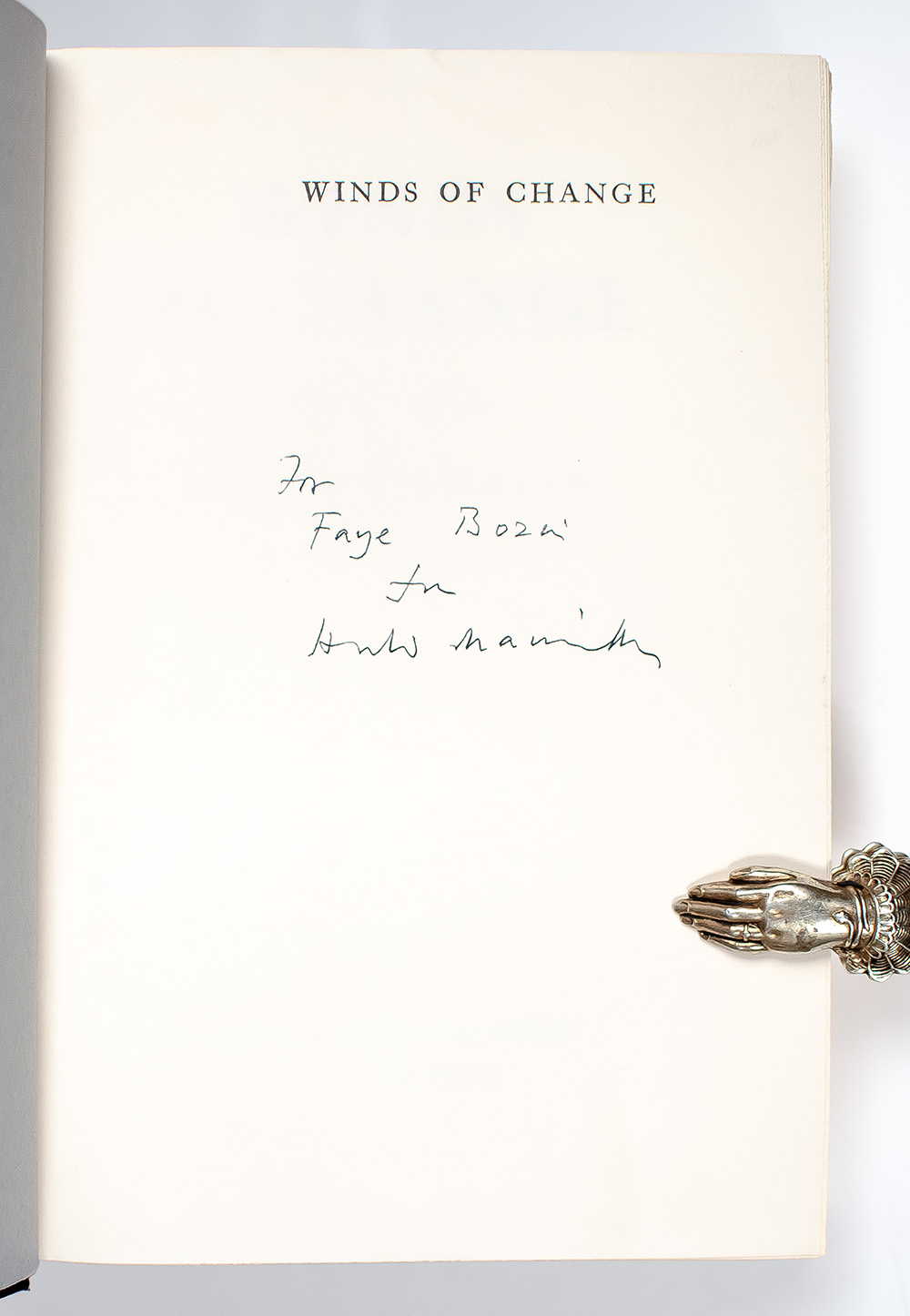 First editions of each volume in Harold Macmillan’s memoirs. Octavo, seven volumes, original cloth, illustrated with photographs. Presentation copy, inscribed by the author on the half-title page of 'Winds of Change,' "For Faye Bozin from Harold Macmillan." Additionally signed by Macmillan on the title page of 'Pointing the Way' and 'The Past Masters.' Each are near fine in very good to near fine dust jackets.