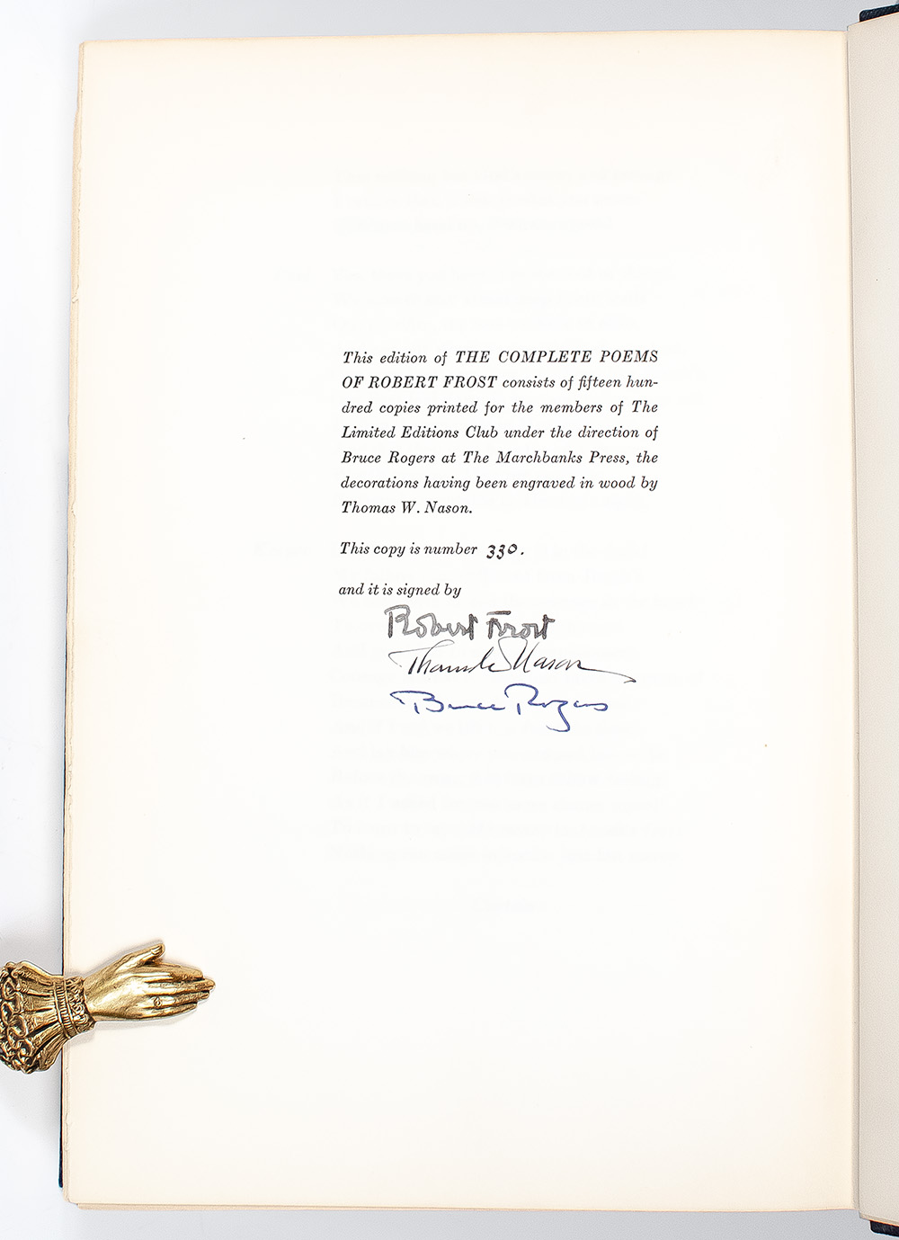 First signed Limited Editions Club edition of the Complete Poems of Robert Frost; one of 1500 copies signed by him, illustrator Thomas A. Nason, and printer Bruce Rogers