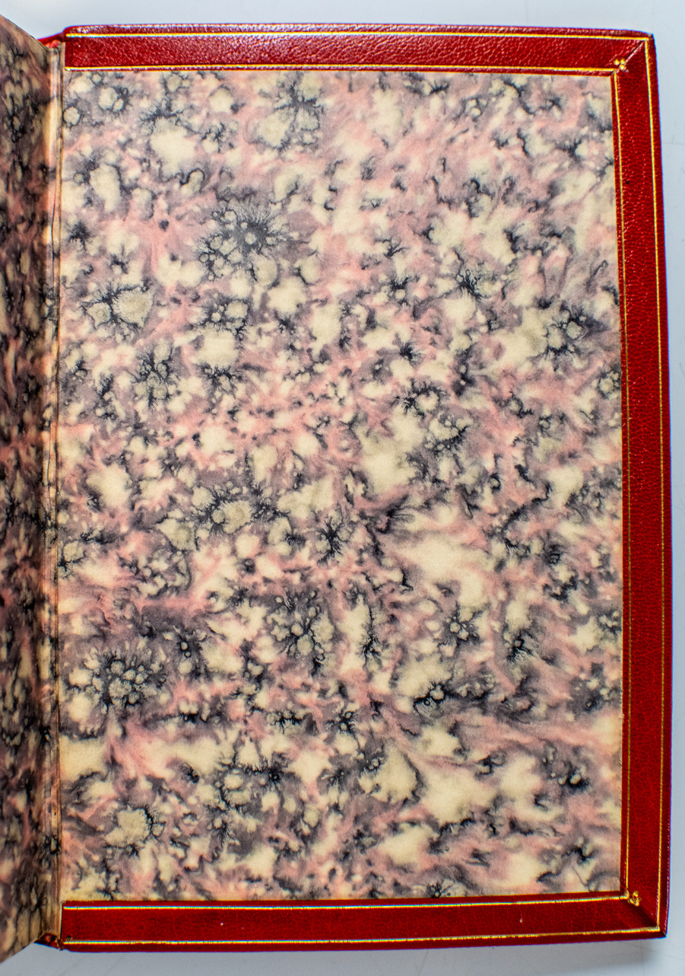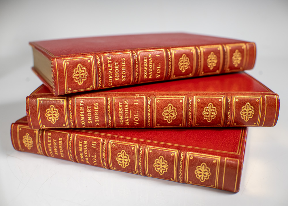 Finely bound set of the complete short stories of W. Somerset Maugham. Octavo, 3 volumes, bound in full morocco by Bayntun-Rivière with gilt titles and tooling to the spine in six compartments within raised gilt bands, double gilt ruled to the front and rear panels, all edges gilt, gilt turn-ins and inner dentelles, marbled endpapers. In fine condition. Housed in a custom cloth slipcase. An exceptional set.