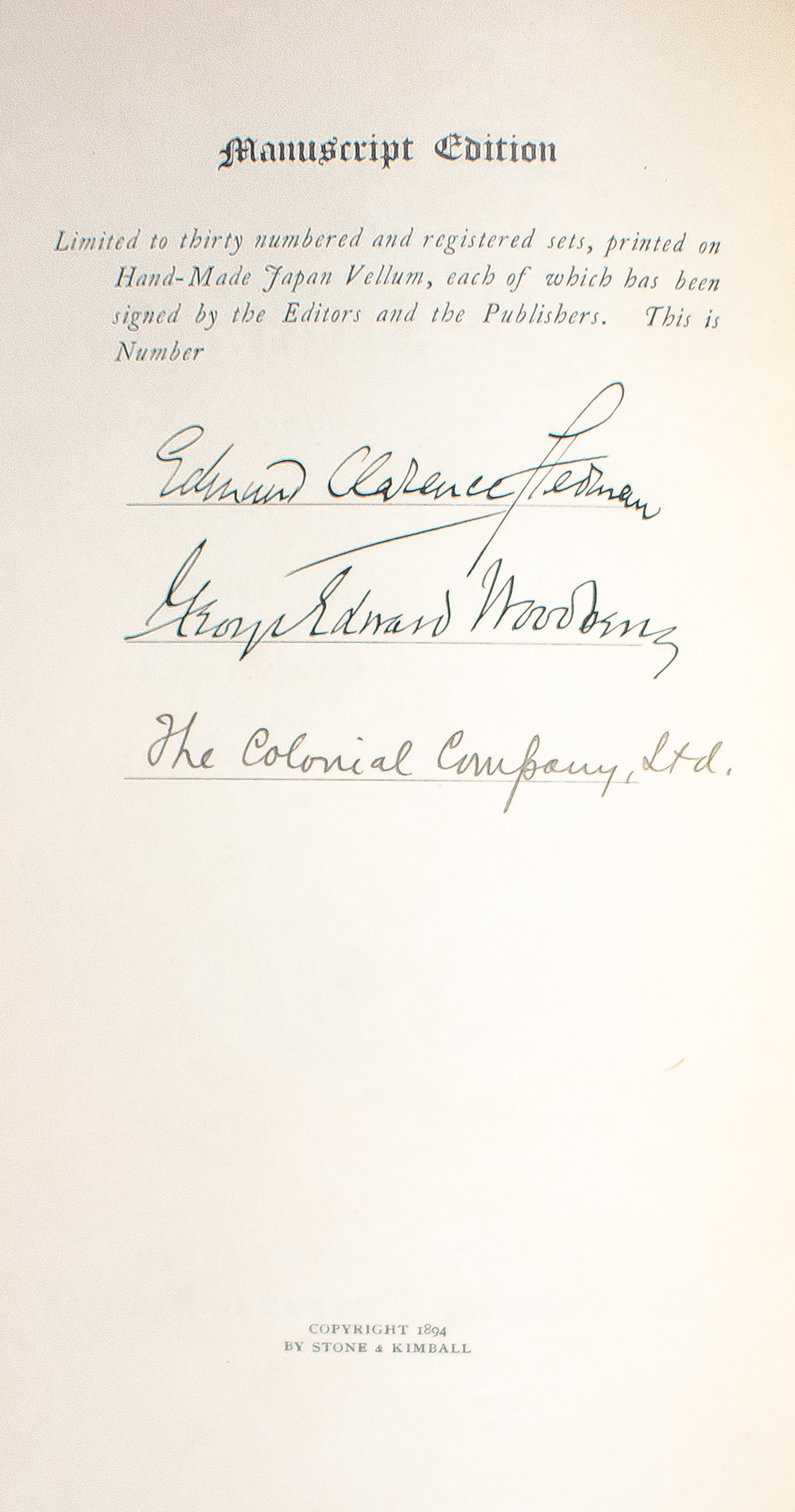Limited manuscript edition of the complete works of Edgar Allan Poe. Octavo, ten volumes, bound in full crushed levant morocco by The Monastery Hill Bindery with gilt titles and ruling to the spine in four compartments within gilt raised bands, gilt turn-ins, top edge gilt, watered silk endpapers, three tissue guarded frontispieces in each volume, illustrated with tissue guarded engravings. One of only thirty copines printed on Japan vellum and signed by editors Edmund Clarence Stedman and George Edward Woodbury on the verso of the title page. In near fine condition. An exceptional set.