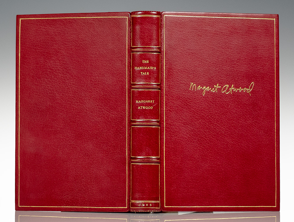 Complete true first edition set of the novels of Margaret Atwood, finely bound in full morocco by the Harcourt Bindery. Octavo, 16 volumes bound in full red crushed levant morocco by the Harcourt Bindery with gilt titles and tooling to the spine in five compartments within raised gilt bands, gilt ruling to the front and rear panels, gilt signature to the front panel of each volume, gilt scrolled inner dentelles stamp-signed by the Harcourt Bindery, marbled endpapers, all edges gilt. Each volume is signed or inscribed by Margaret Atwood. In fine condition. Founded over a century ago in 1900, the Harcourt Bindery is the oldest and largest traditional bindery in America exclusively devoted to fine traditional leather bookbinding by hand. A completely unique set.