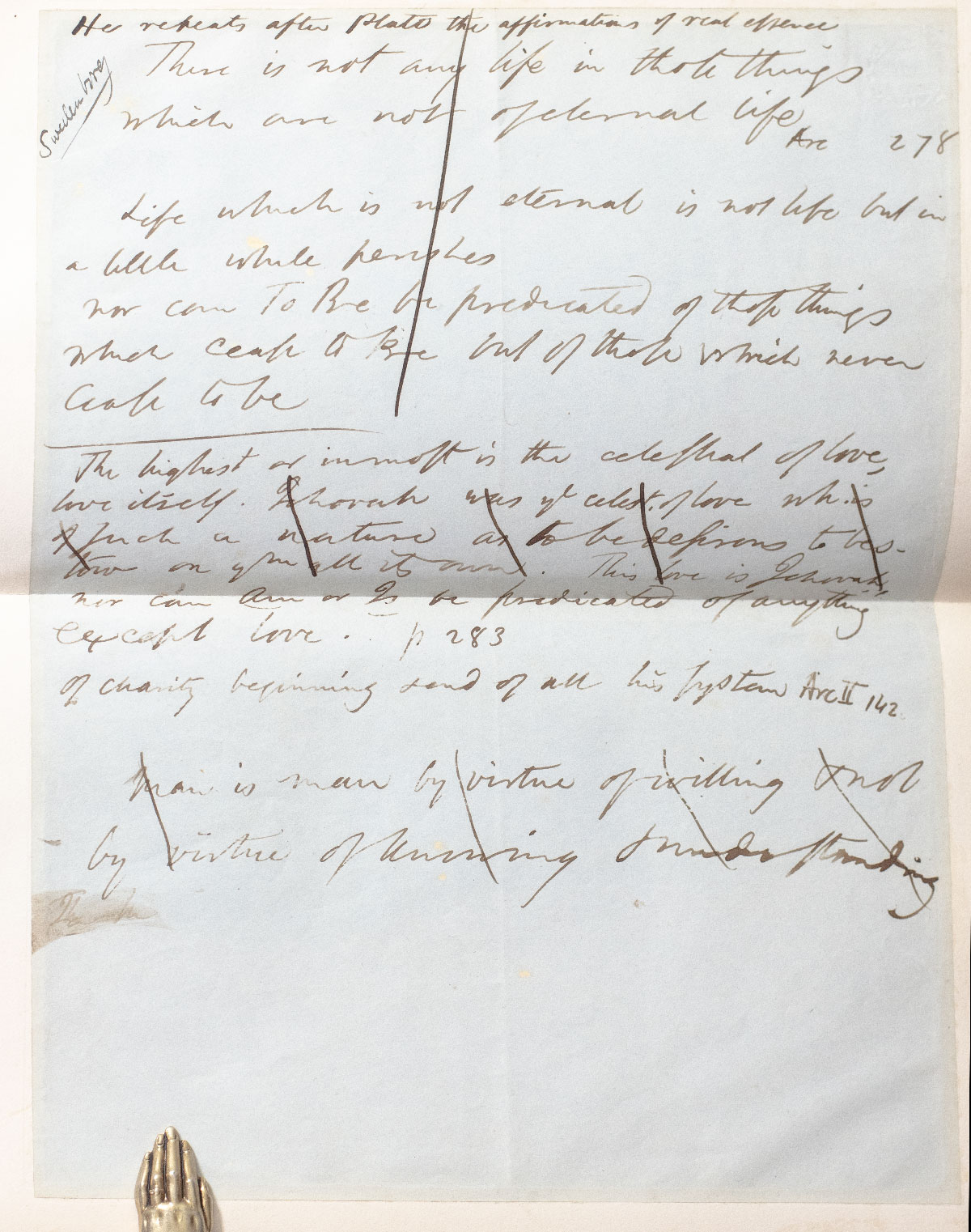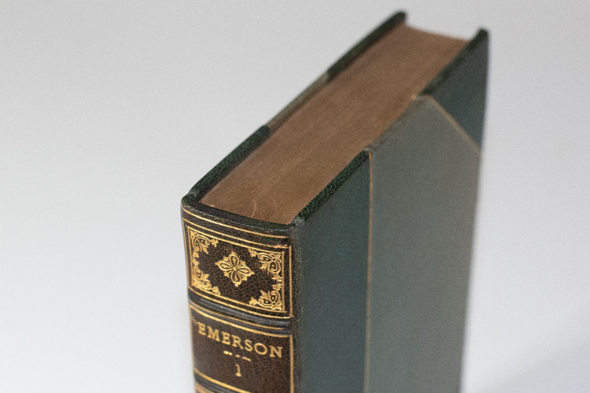 The Autograph Centenary edition of Emerson's complete works with an autograph manuscript in his hand and with his notations tipped in. One of six hundred copies additionally signed by the publisher, this is number 576. Octavo, 12 volumes bound in three quarter morocco with gilt titles and tooling to the spine in six compartments within raised gilt bands, marbled endpapers, top edge gilt, illustrated with photogravures including tissue-guarded frontispiece portrait of Emerson. Tipped into volume I, the manuscript in Emerson's hand reads in part, "He repeats after Plato the affirmations of real essence. There is not any life in those things which are not eternal life. Life which is not eternal is not life but in a little while perishes nor can To Be be predicated on those things which cease to Be and of those which never cease to be." In near fine condition.