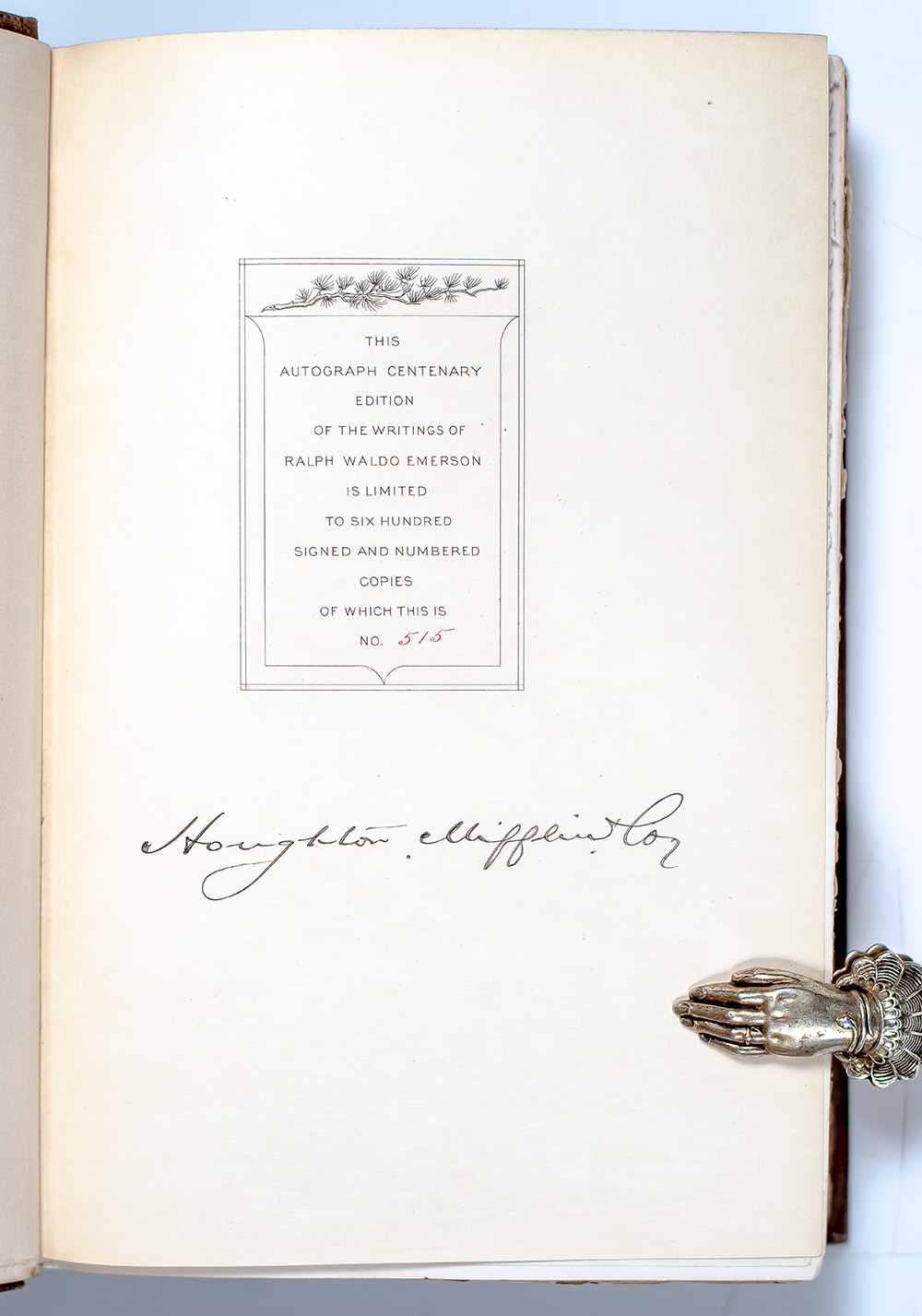 "The hospitable soul makes me wiser and bolder by provocation": The Autograph Centenary edition of the writings of Ralph Waldo Emerson; one of 600 numbered copies containing a double sided manuscript in Emerson’s hand bound into vol. i