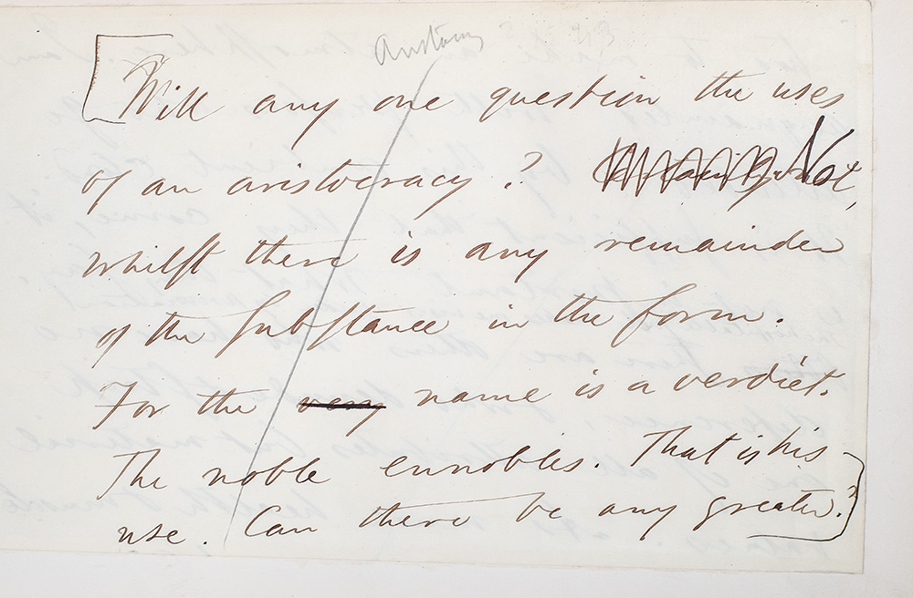 The Autograph Centenary edition of the writings of Ralph Waldo Emerson, one of 600 numbered copies containing a double sided manuscript in Emerson’s hand bound into volume one. Octavo, 12 volumes, original publisher’s cloth with printed paper spine labels, illustrated with numerous mounted photogravures, frontispiece portrait of Emerson to Vol. I with lettered tissue guard. One of 600 numbered copies signed by the publisher and with an original double sided manuscript in Emerson’s hand bound into volume one, this is number 515. The manuscript leaf reads in full, "Will anyone question the will of an aristocracy? Not, whilst there is any remainder of the substance in the form. For the name is a verdict. The noble ennoblis. That is his use. Can there be any greater? ... two to make and atmosphere. I am acquainted with persons who go attended by this ambient cloud. It is sufficient that they come, it is not important what they say. The hospitable soul makes me wiser + bolder by provocation. There are others who have no deference, + who ... one of all attributes but material values. As much health + muscle..." In near fine condition.